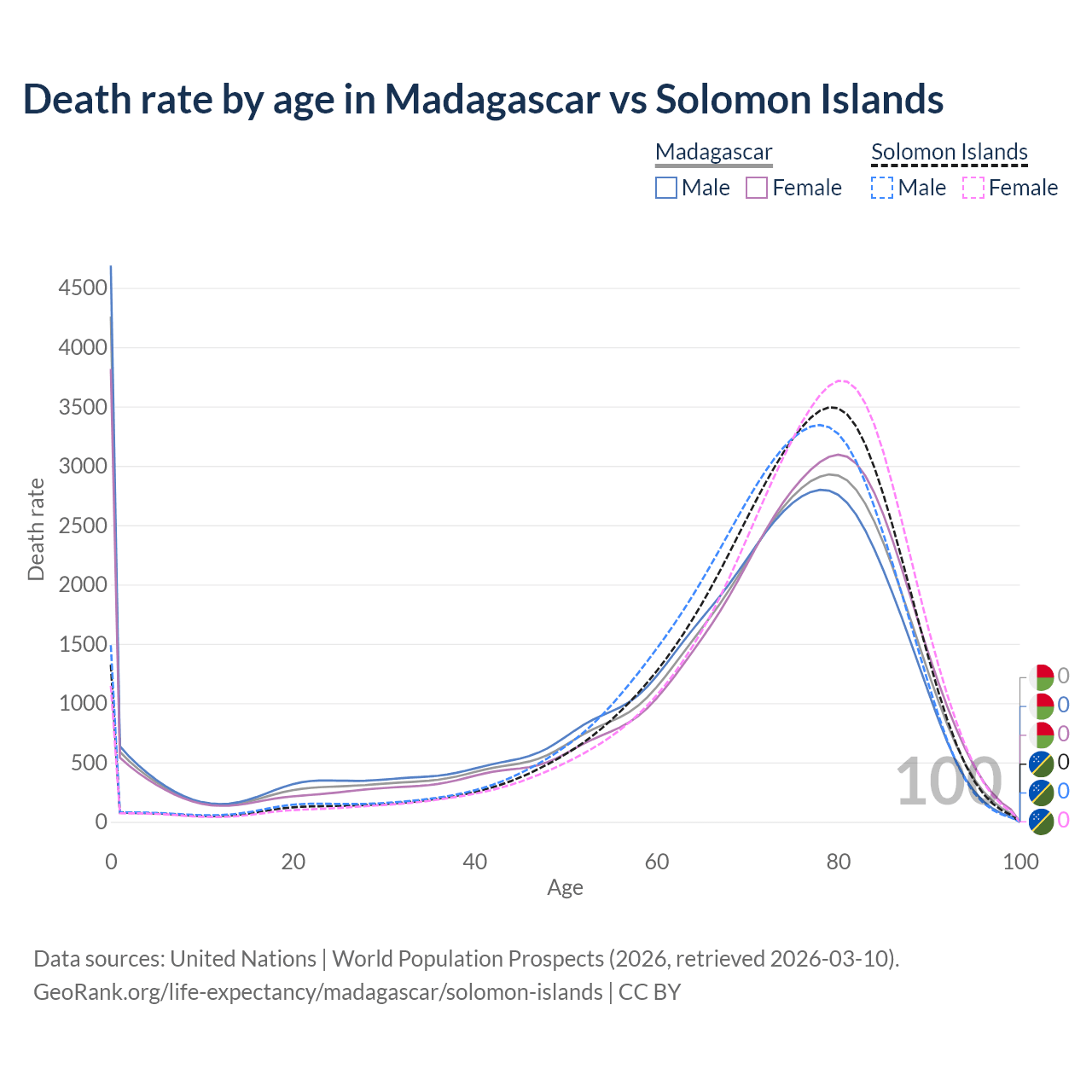 In Madagascar, the most common age of death is 0, compared to 79 in the Solomon Islands. The median age of death is 72.2 in Madagascar and 74.9 in the Solomon Islands, meaning only half of each cohort is expected to live past that age.