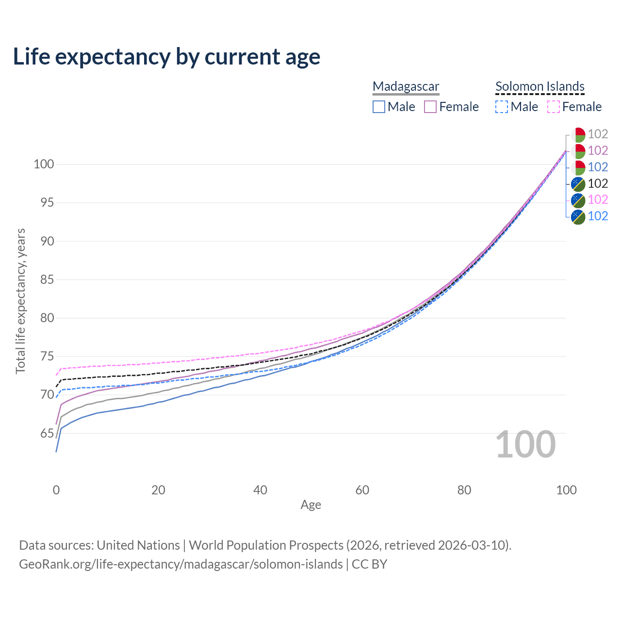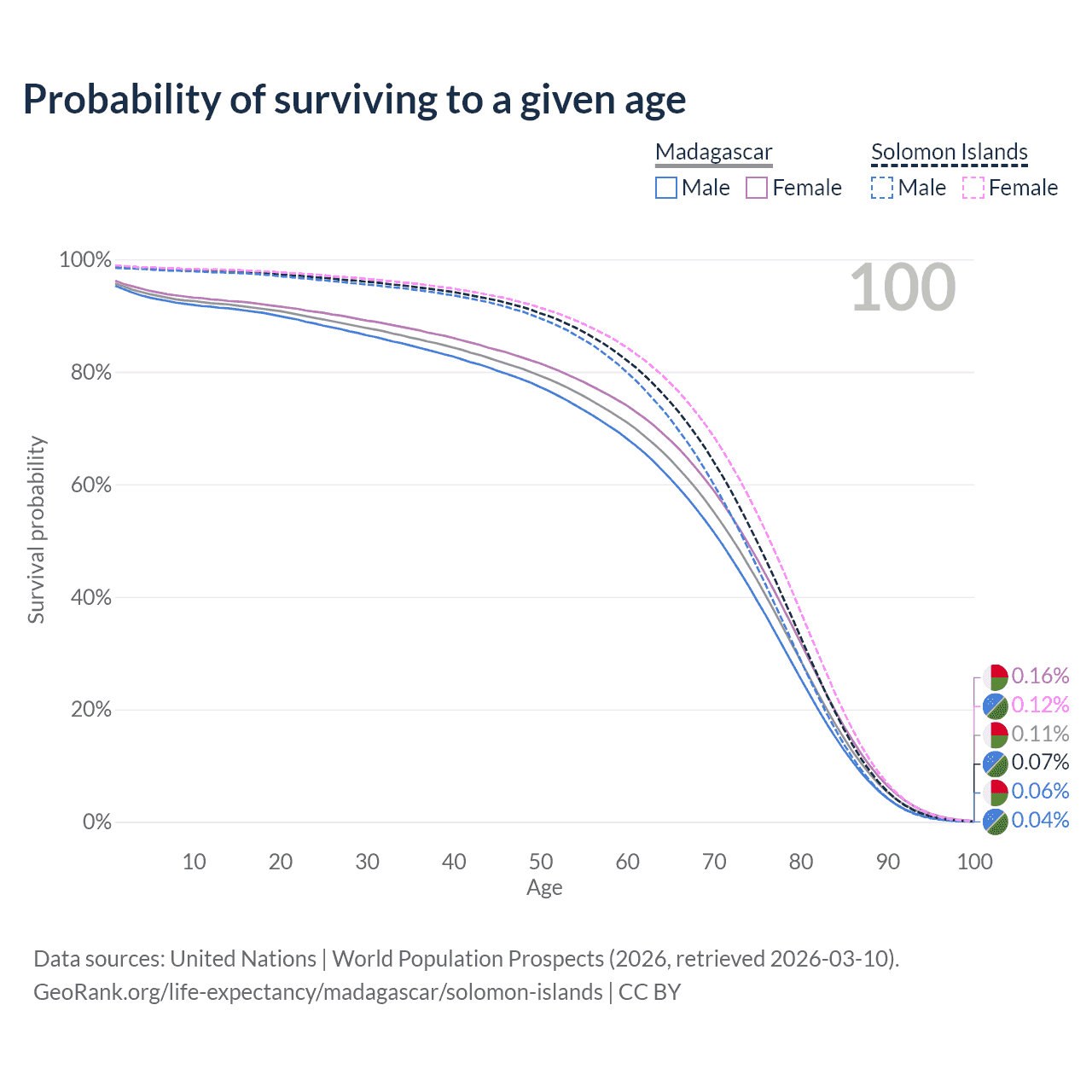 This life expectancy calculator shows the odds of living to 100, 95, 90, and below based on current age for both males and females in Madagascar and the Solomon Islands, along with mean and median age of death. The calculations are based on the 2026 life tables (actuarial tables) from the UN World Population Prospects.