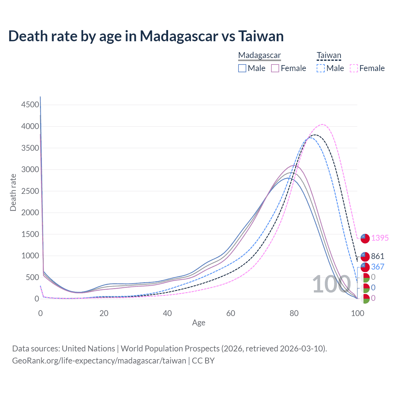In Madagascar, the most common age of death is 0, compared to 87 in Taiwan. The median age of death is 72.2 in Madagascar and 84.3 in Taiwan, meaning only half of each cohort is expected to live past that age.
