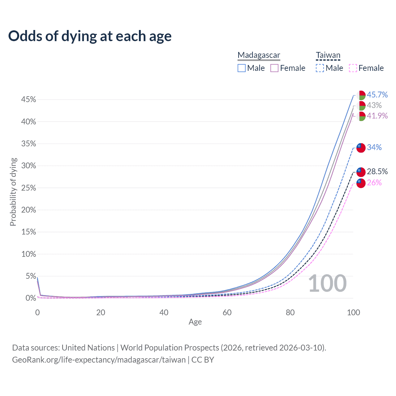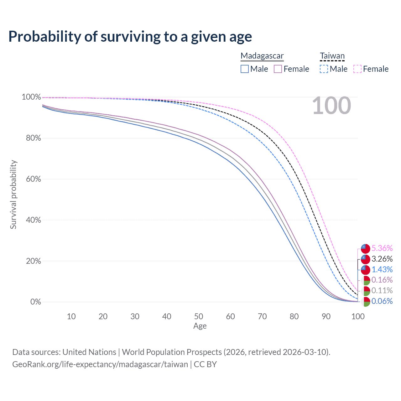 This life expectancy calculator shows the odds of living to 100, 95, 90, and below based on current age for both males and females in Madagascar and Taiwan, along with mean and median age of death. The calculations are based on the 2026 life tables (actuarial tables) from the UN World Population Prospects.