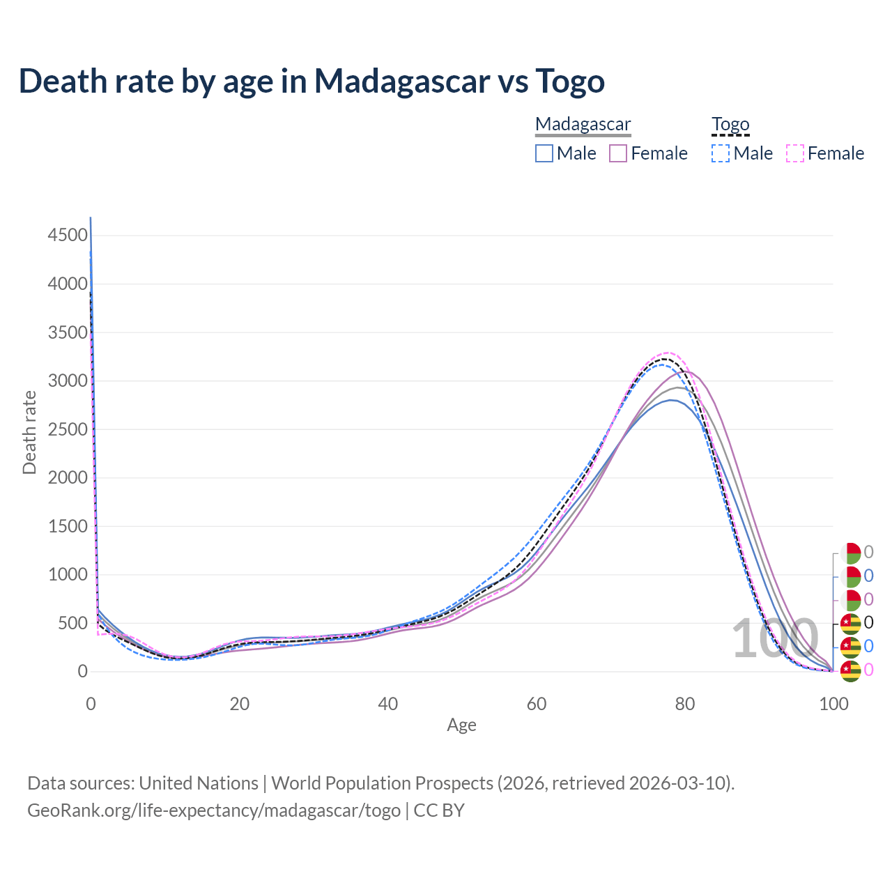 In Madagascar, the most common age of death is 0, compared to 0 in Togo. The median age of death is 72.2 in Madagascar and 71 in Togo, meaning only half of each cohort is expected to live past that age.