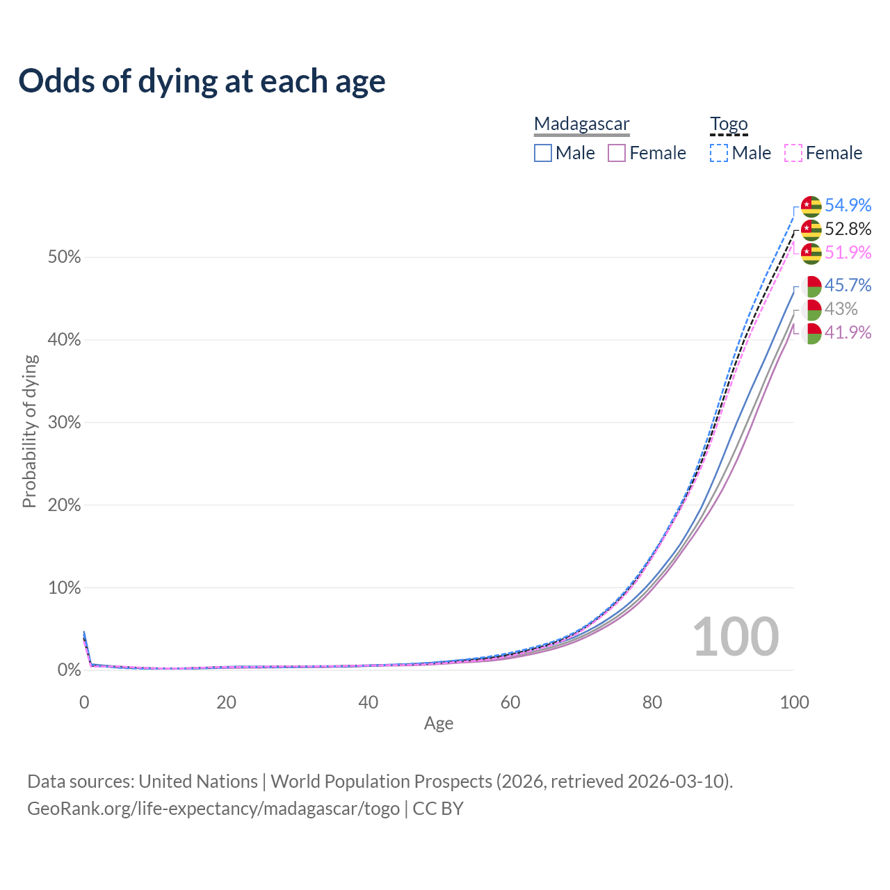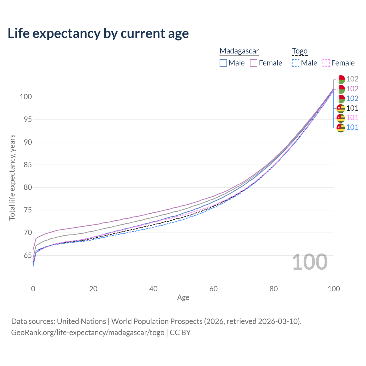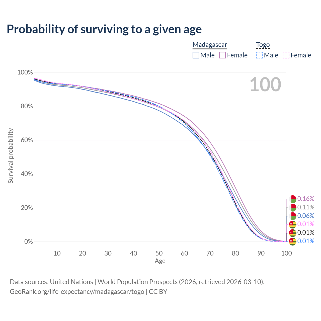 This life expectancy calculator shows the odds of living to 100, 95, 90, and below based on current age for both males and females in Madagascar and Togo, along with mean and median age of death. The calculations are based on the 2026 life tables (actuarial tables) from the UN World Population Prospects.
