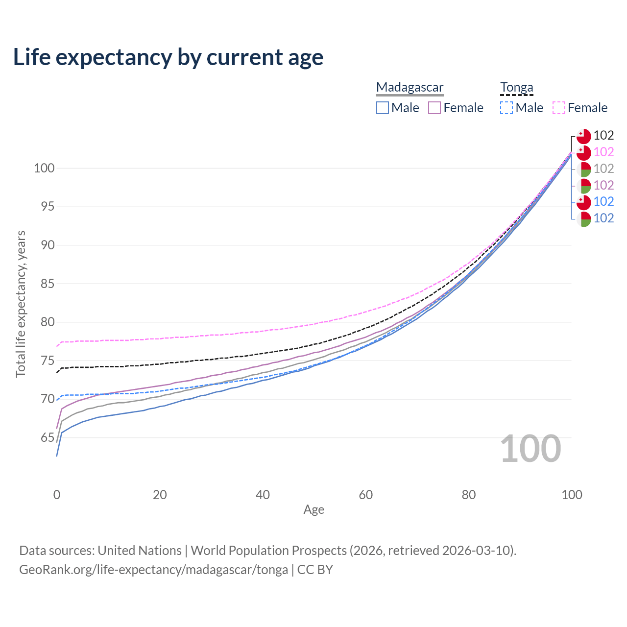 This life expectancy calculator shows the odds of living to 100, 95, 90, and below based on current age for both males and females in Madagascar and Tonga, along with mean and median age of death. The calculations are based on the 2026 life tables (actuarial tables) from the UN World Population Prospects.