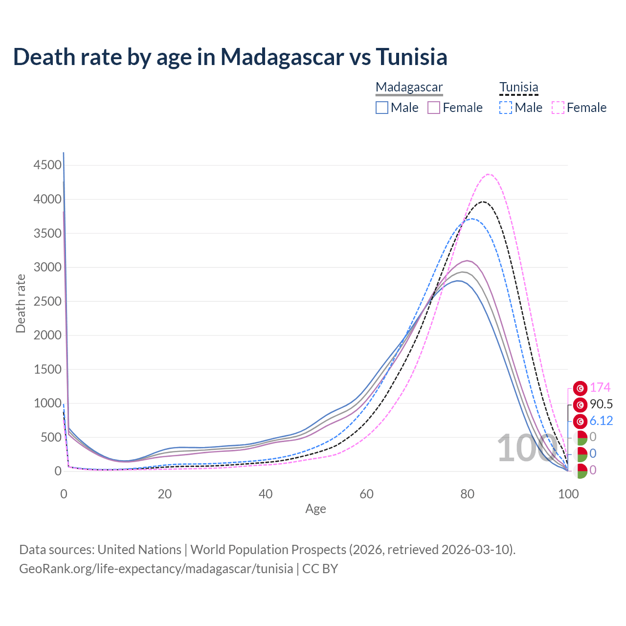 In Madagascar, the most common age of death is 0, compared to 83 in Tunisia. The median age of death is 72.2 in Madagascar and 80.2 in Tunisia, meaning only half of each cohort is expected to live past that age.
