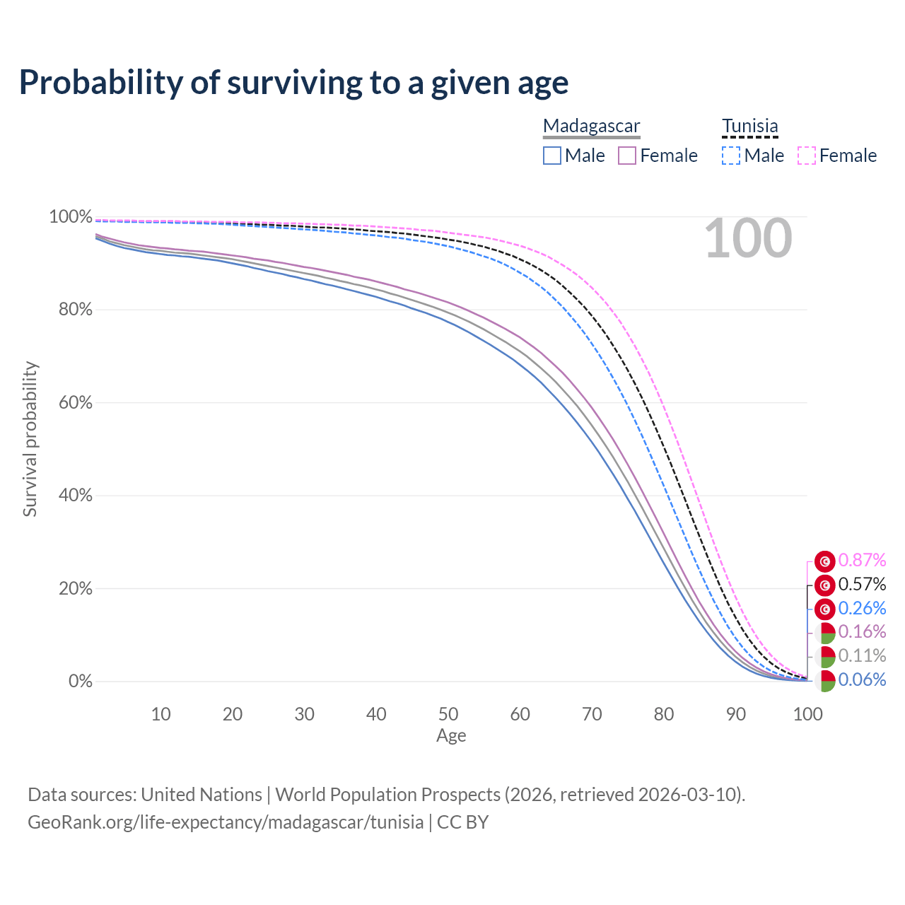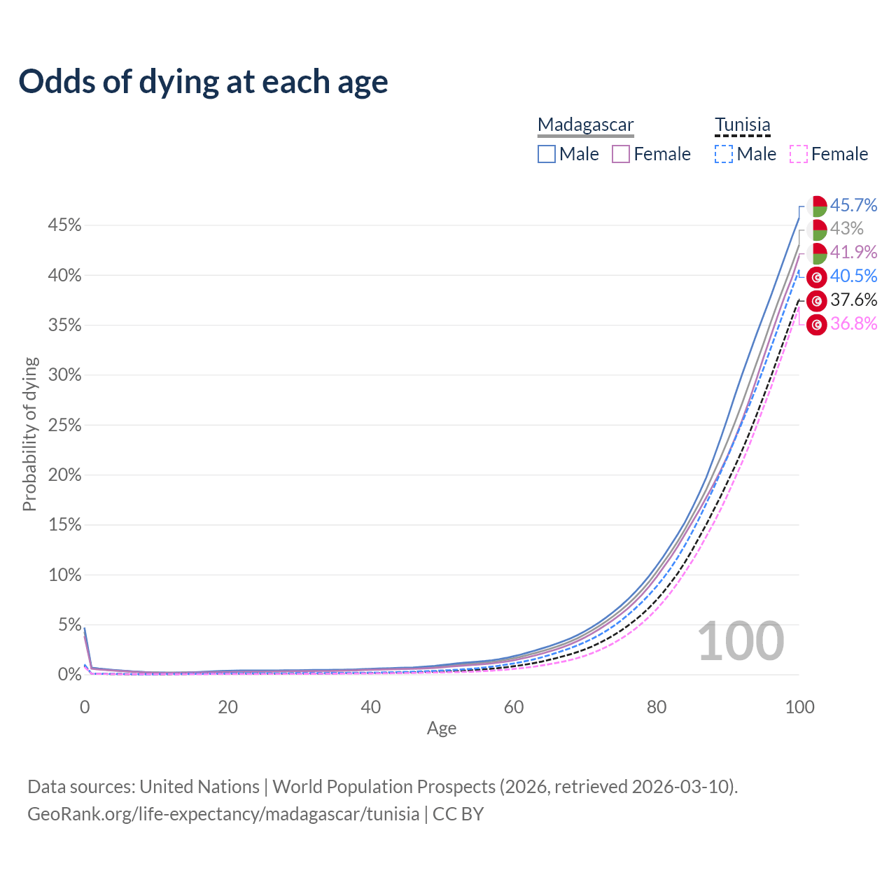 This life expectancy calculator shows the odds of living to 100, 95, 90, and below based on current age for both males and females in Madagascar and Tunisia, along with mean and median age of death. The calculations are based on the 2026 life tables (actuarial tables) from the UN World Population Prospects.