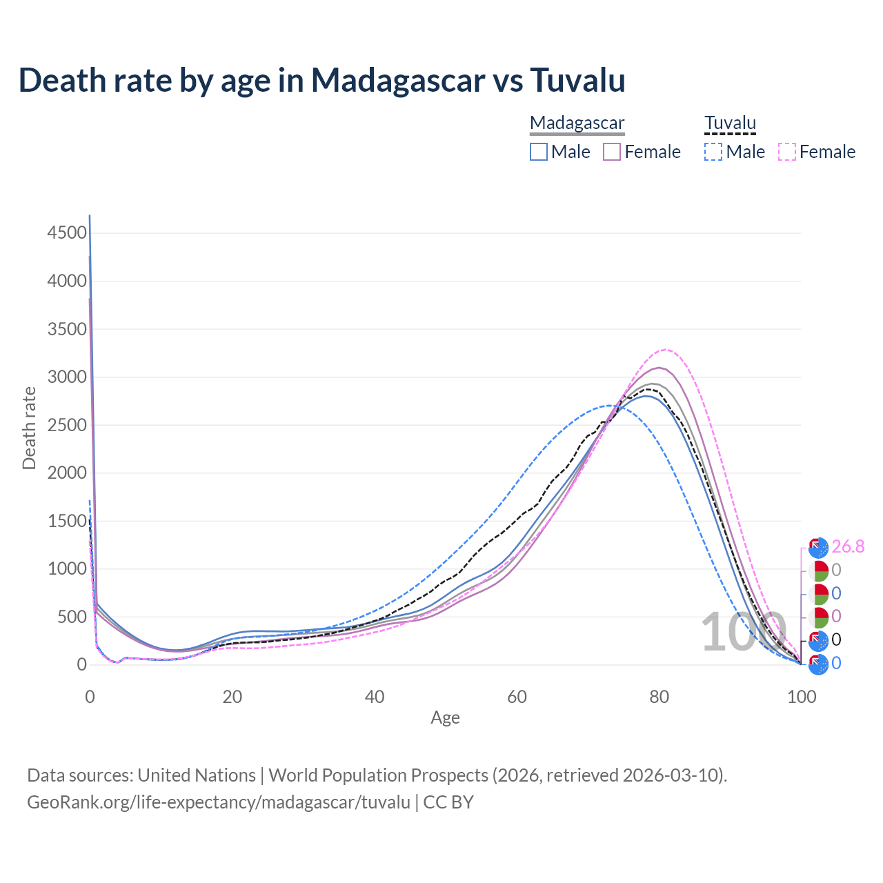 In Madagascar, the most common age of death is 0, compared to 78 in Tuvalu. The median age of death is 72.2 in Madagascar and 71.9 in Tuvalu, meaning only half of each cohort is expected to live past that age.