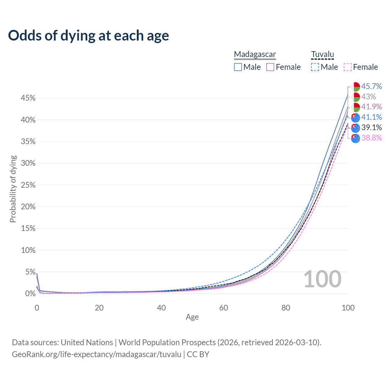 This life expectancy calculator shows the odds of living to 100, 95, 90, and below based on current age for both males and females in Madagascar and Tuvalu, along with mean and median age of death. The calculations are based on the 2026 life tables (actuarial tables) from the UN World Population Prospects.