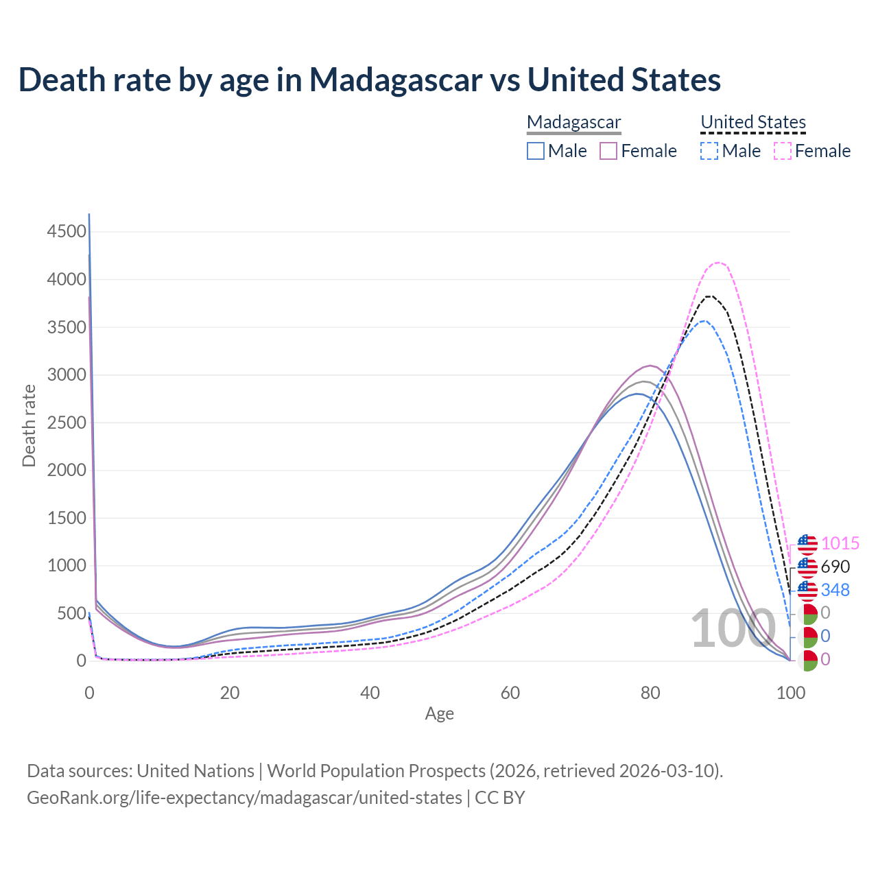 In Madagascar, the most common age of death is 0, compared to 89 in the United States. The median age of death is 72.2 in Madagascar and 83.9 in the United States, meaning only half of each cohort is expected to live past that age.