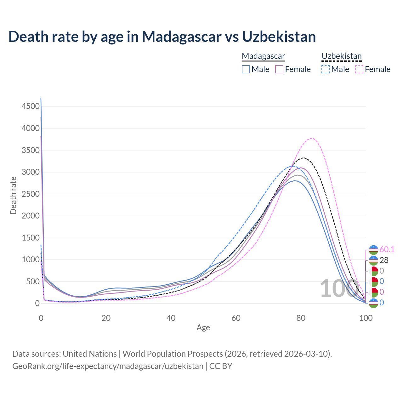 In Madagascar, the most common age of death is 0, compared to 81 in Uzbekistan. The median age of death is 72.2 in Madagascar and 76.4 in Uzbekistan, meaning only half of each cohort is expected to live past that age.
