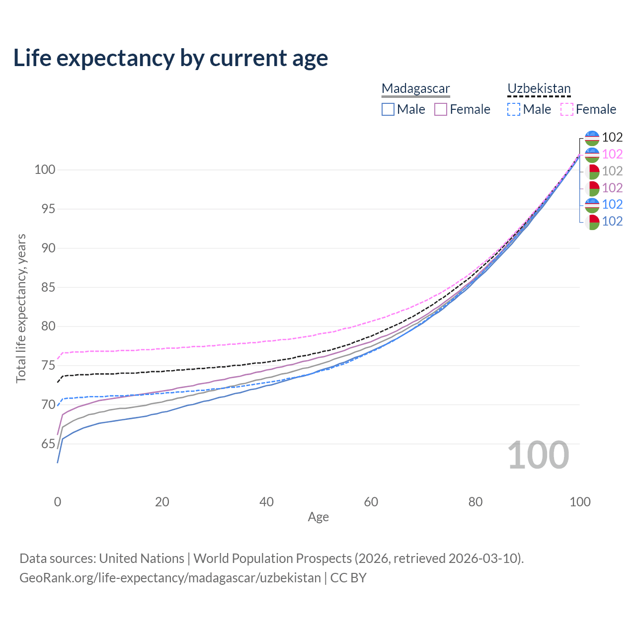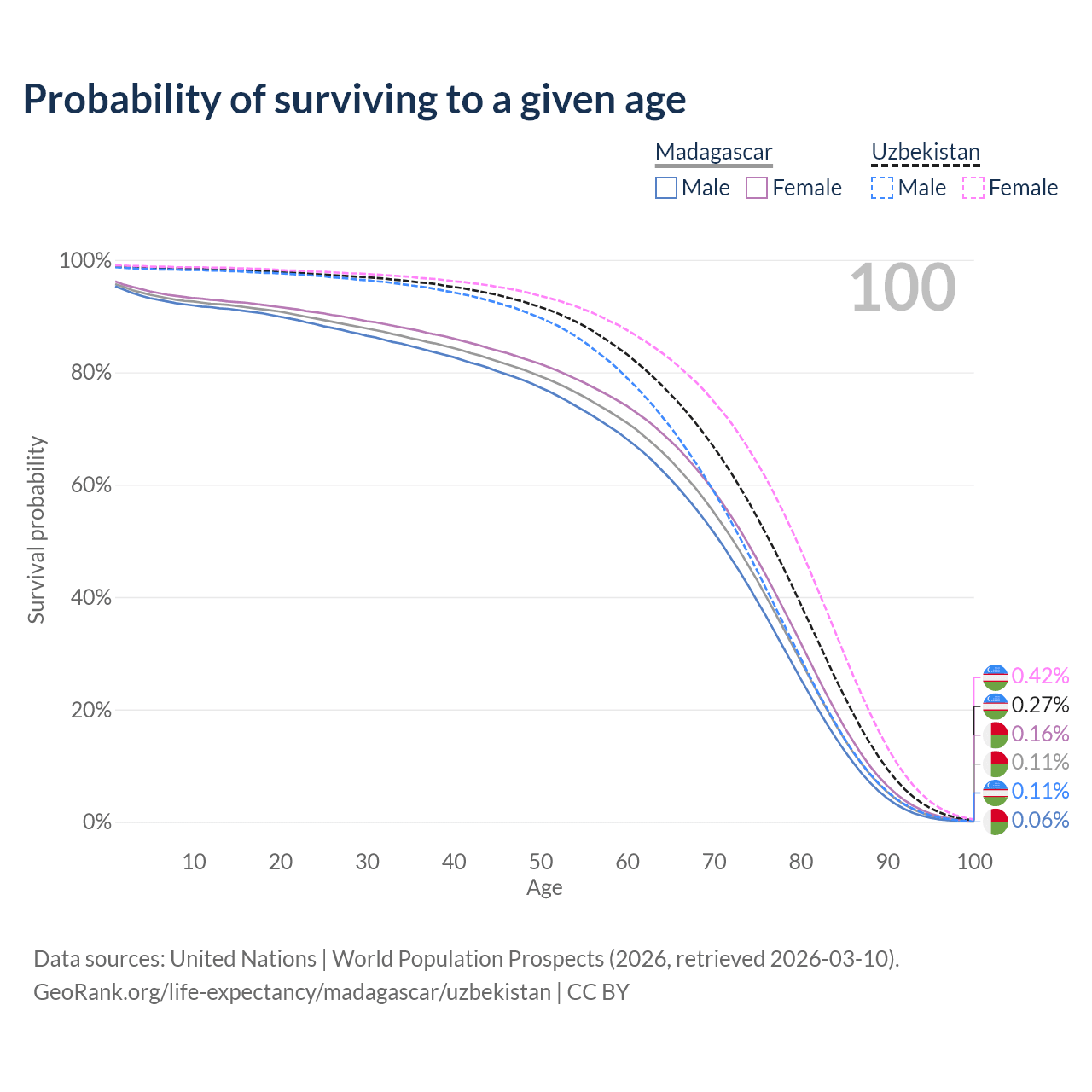 This life expectancy calculator shows the odds of living to 100, 95, 90, and below based on current age for both males and females in Madagascar and Uzbekistan, along with mean and median age of death. The calculations are based on the 2026 life tables (actuarial tables) from the UN World Population Prospects.