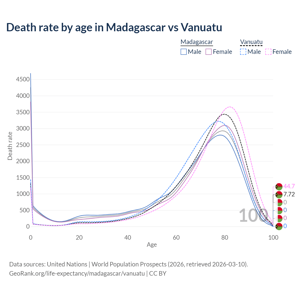 In Madagascar, the most common age of death is 0, compared to 80 in Vanuatu. The median age of death is 72.2 in Madagascar and 75.9 in Vanuatu, meaning only half of each cohort is expected to live past that age.