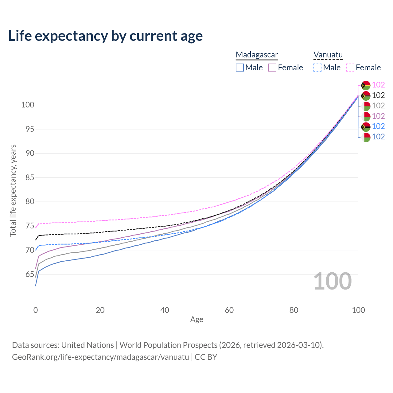 This life expectancy calculator shows the odds of living to 100, 95, 90, and below based on current age for both males and females in Madagascar and Vanuatu, along with mean and median age of death. The calculations are based on the 2026 life tables (actuarial tables) from the UN World Population Prospects.
