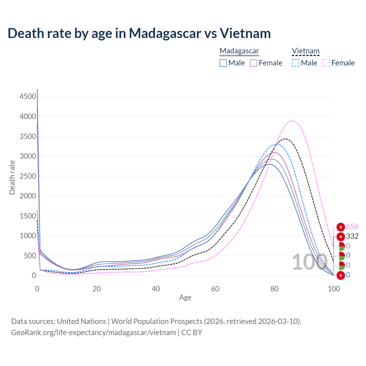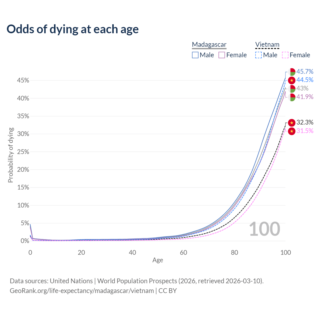 This life expectancy calculator shows the odds of living to 100, 95, 90, and below based on current age for both males and females in Madagascar and Vietnam, along with mean and median age of death. The calculations are based on the 2026 life tables (actuarial tables) from the UN World Population Prospects.