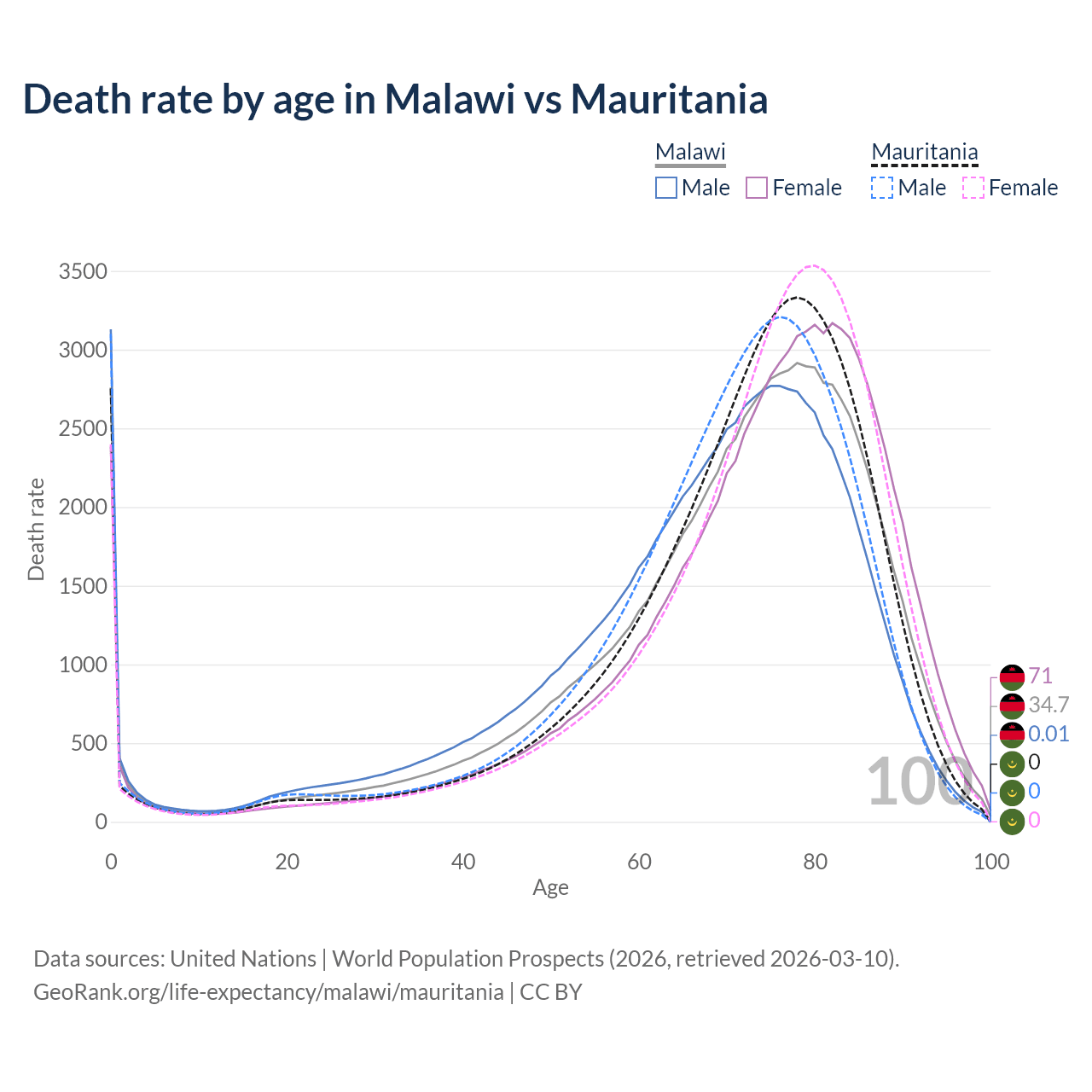 In Malawi, the most common age of death is 78, compared to 78 in Mauritania. The median age of death is 73.1 in Malawi and 74.1 in Mauritania, meaning only half of each cohort is expected to live past that age.