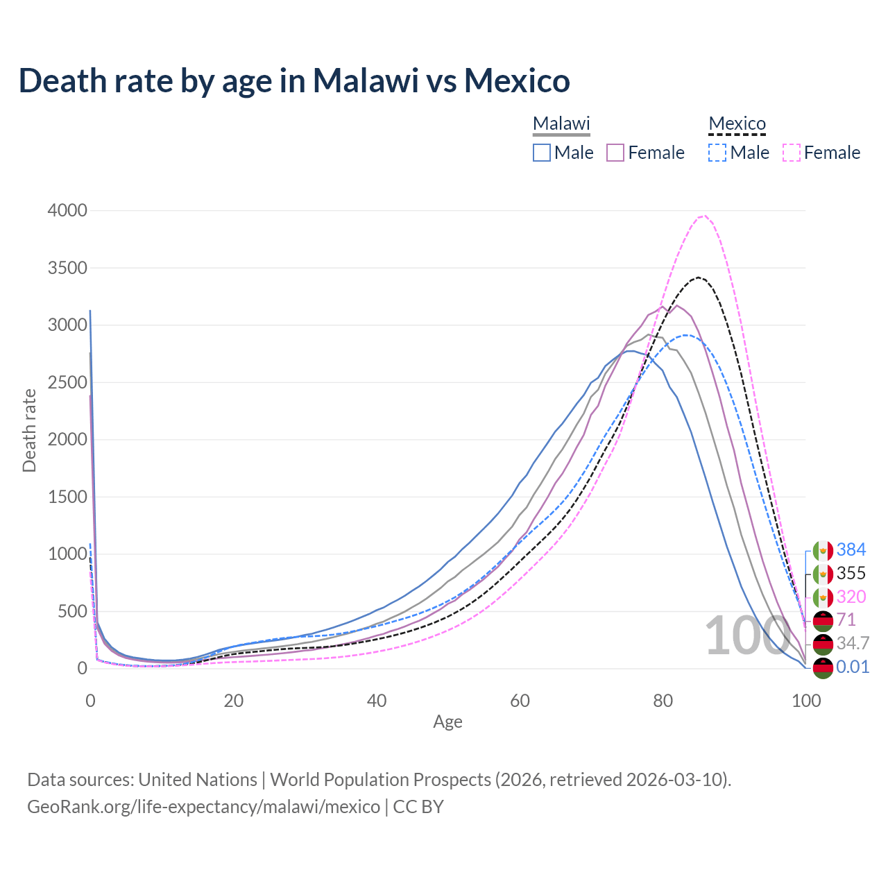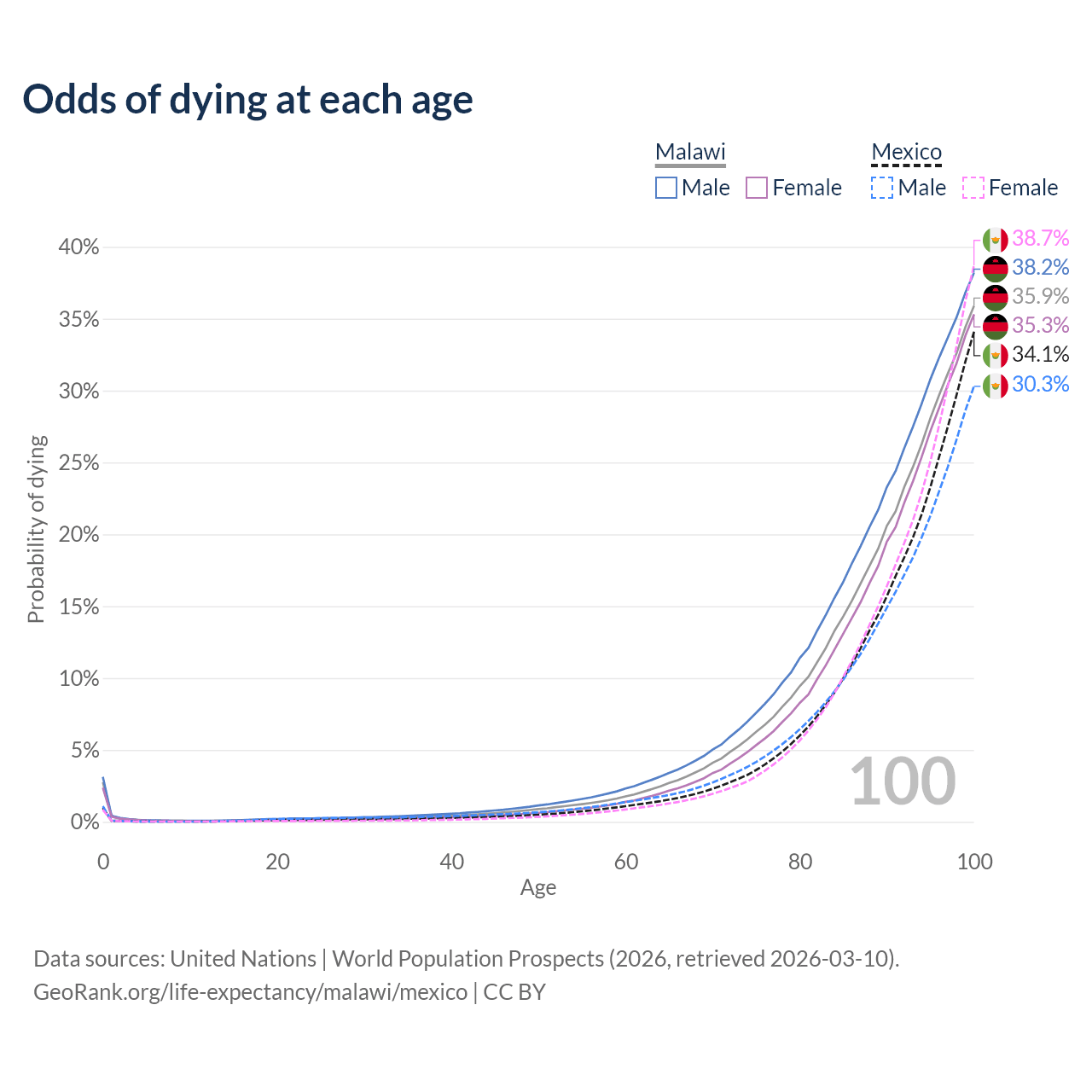 This life expectancy calculator shows the odds of living to 100, 95, 90, and below based on current age for both males and females in Malawi and Mexico, along with mean and median age of death. The calculations are based on the 2026 life tables (actuarial tables) from the UN World Population Prospects.