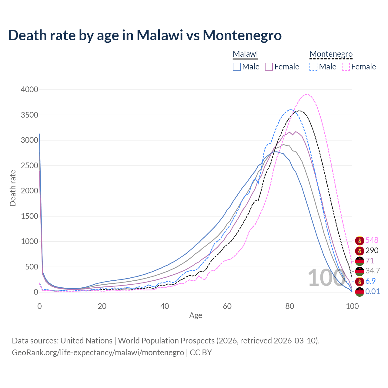 This life expectancy calculator shows the odds of living to 100, 95, 90, and below based on current age for both males and females in Malawi and Montenegro, along with mean and median age of death. The calculations are based on the 2026 life tables (actuarial tables) from the UN World Population Prospects.
