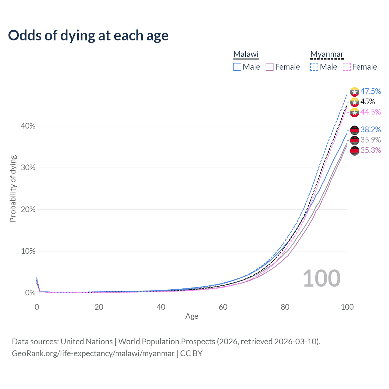 This life expectancy calculator shows the odds of living to 100, 95, 90, and below based on current age for both males and females in Malawi and Myanmar, along with mean and median age of death. The calculations are based on the 2026 life tables (actuarial tables) from the UN World Population Prospects.