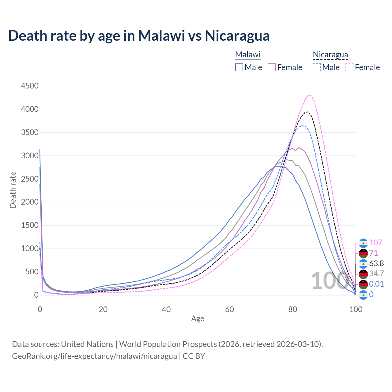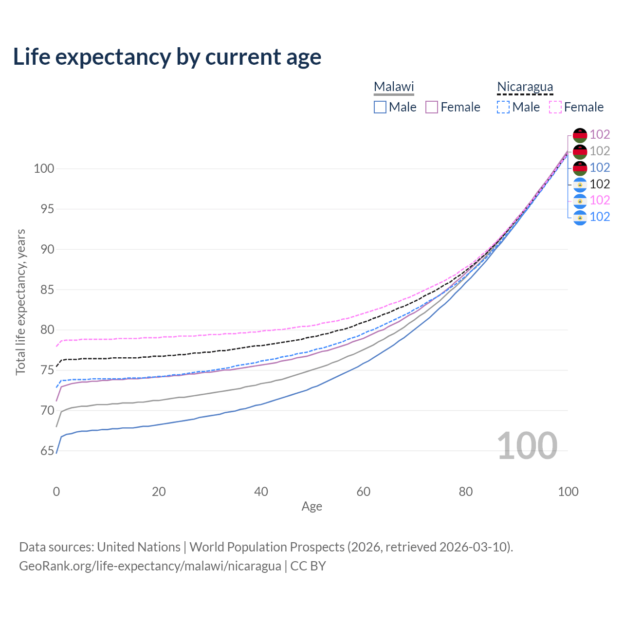 This life expectancy calculator shows the odds of living to 100, 95, 90, and below based on current age for both males and females in Malawi and Nicaragua, along with mean and median age of death. The calculations are based on the 2026 life tables (actuarial tables) from the UN World Population Prospects.