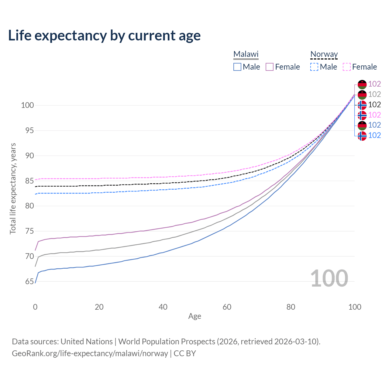 This life expectancy calculator shows the odds of living to 100, 95, 90, and below based on current age for both males and females in Malawi and Norway, along with mean and median age of death. The calculations are based on the 2026 life tables (actuarial tables) from the UN World Population Prospects.