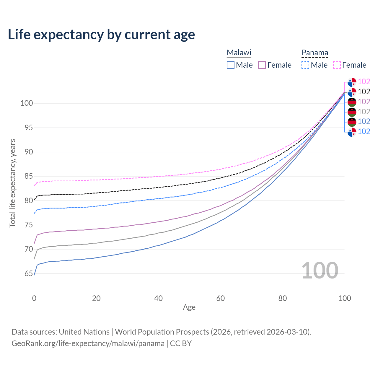 This life expectancy calculator shows the odds of living to 100, 95, 90, and below based on current age for both males and females in Malawi and Panama, along with mean and median age of death. The calculations are based on the 2026 life tables (actuarial tables) from the UN World Population Prospects.