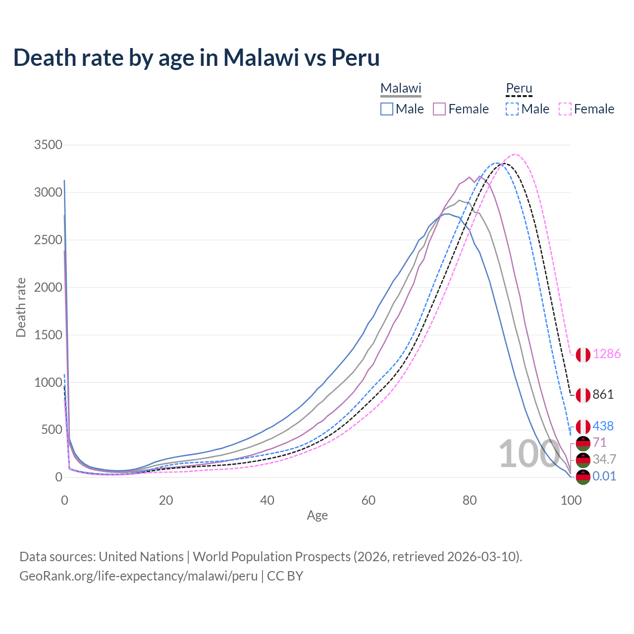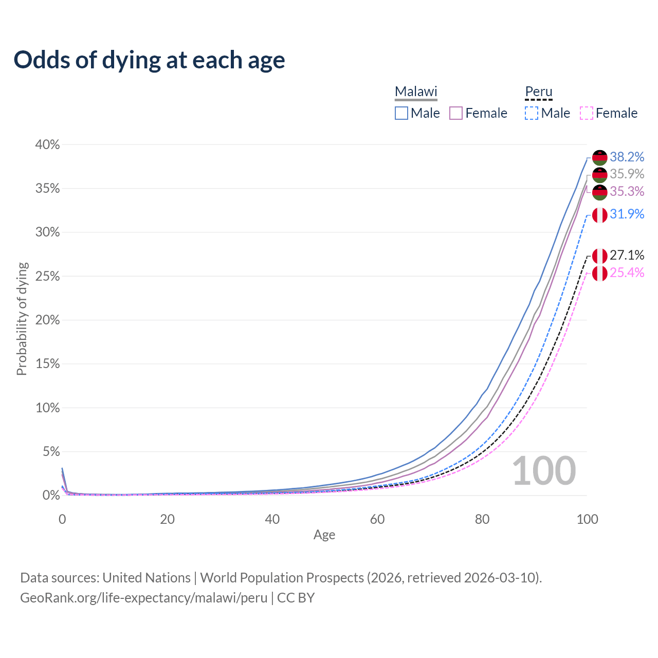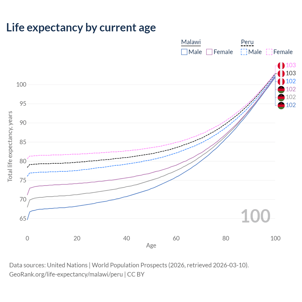This life expectancy calculator shows the odds of living to 100, 95, 90, and below based on current age for both males and females in Malawi and Peru, along with mean and median age of death. The calculations are based on the 2026 life tables (actuarial tables) from the UN World Population Prospects.