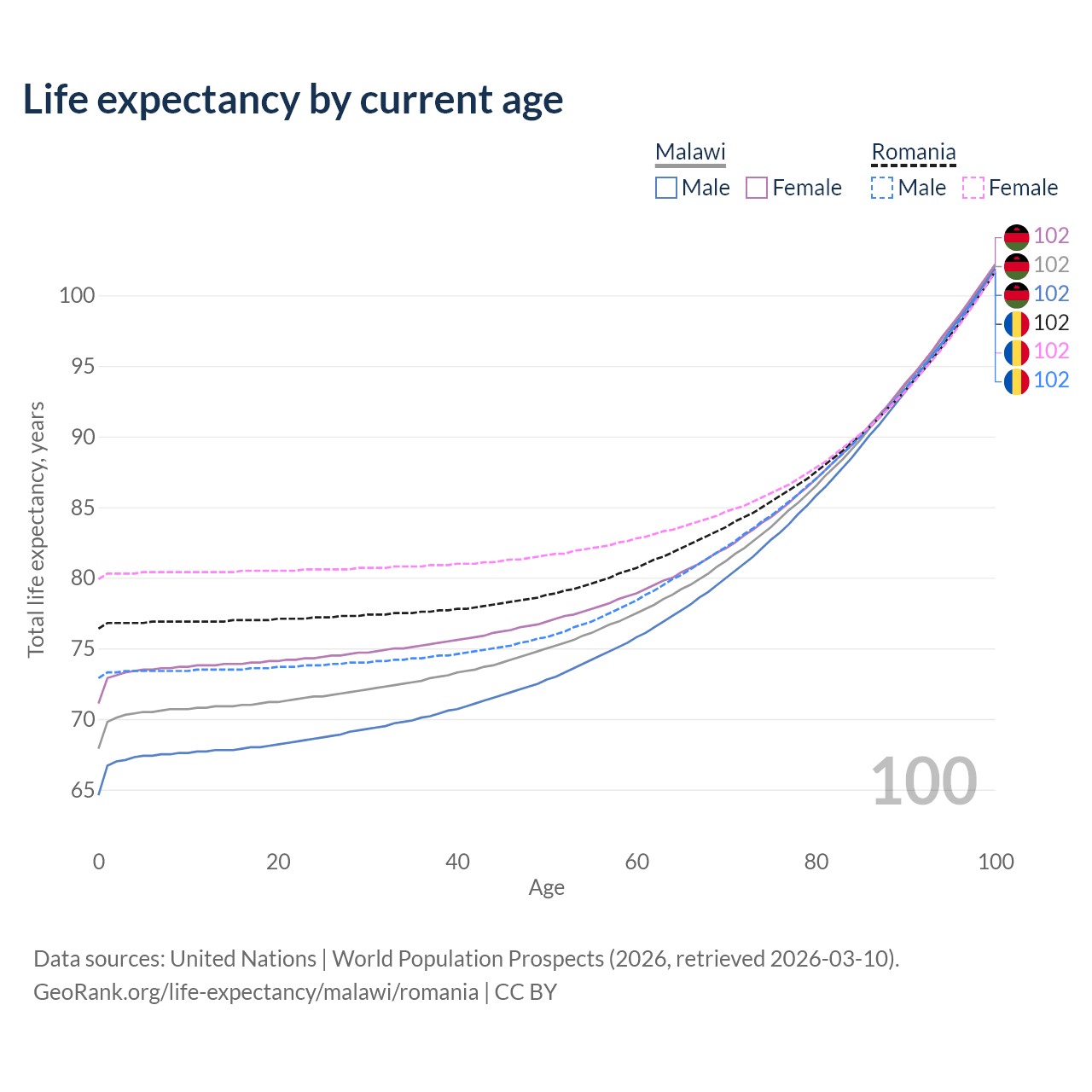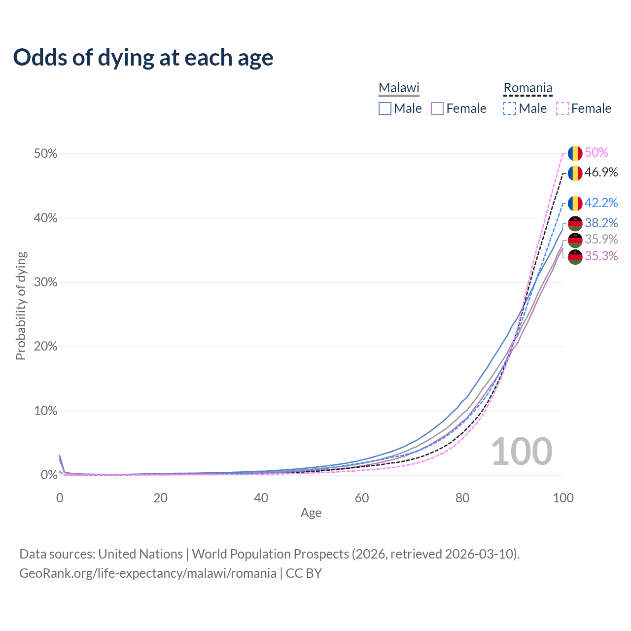 This life expectancy calculator shows the odds of living to 100, 95, 90, and below based on current age for both males and females in Malawi and Romania, along with mean and median age of death. The calculations are based on the 2026 life tables (actuarial tables) from the UN World Population Prospects.