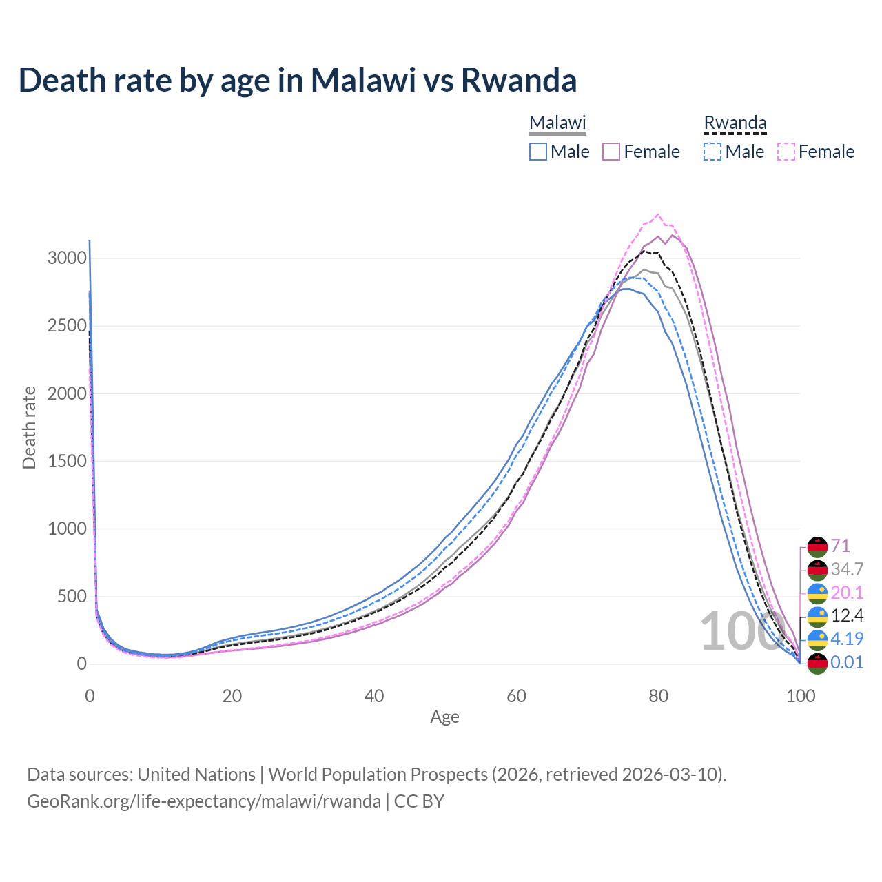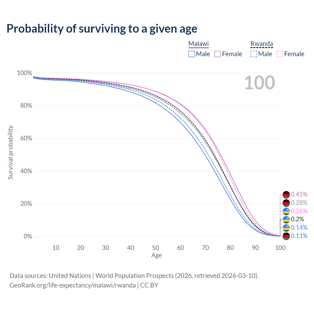 This life expectancy calculator shows the odds of living to 100, 95, 90, and below based on current age for both males and females in Malawi and Rwanda, along with mean and median age of death. The calculations are based on the 2026 life tables (actuarial tables) from the UN World Population Prospects.