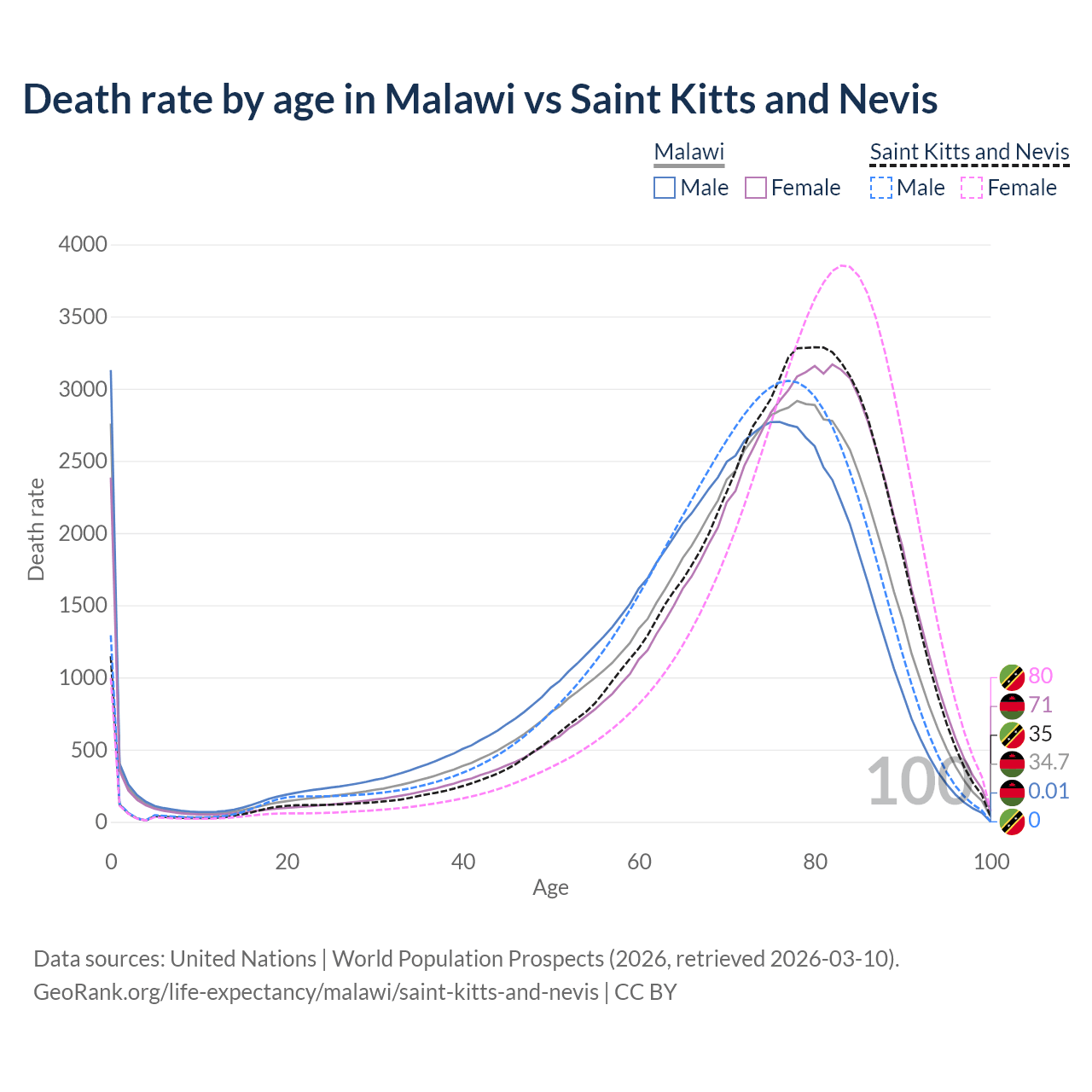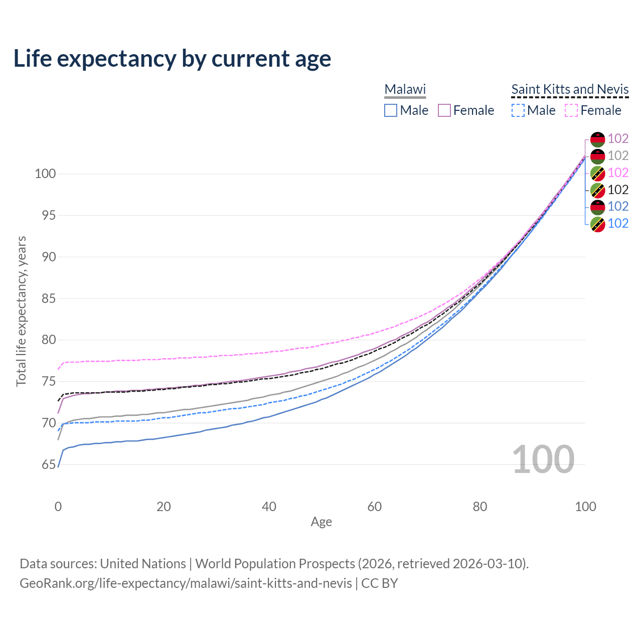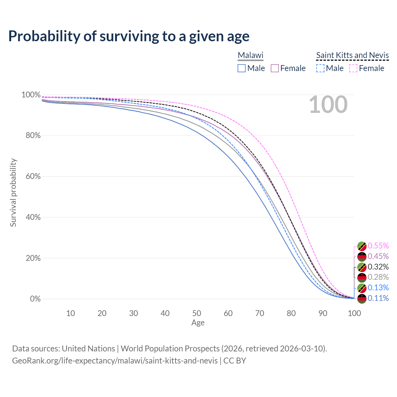 This life expectancy calculator shows the odds of living to 100, 95, 90, and below based on current age for both males and females in Malawi and Saint Kitts and Nevis, along with mean and median age of death. The calculations are based on the 2026 life tables (actuarial tables) from the UN World Population Prospects.