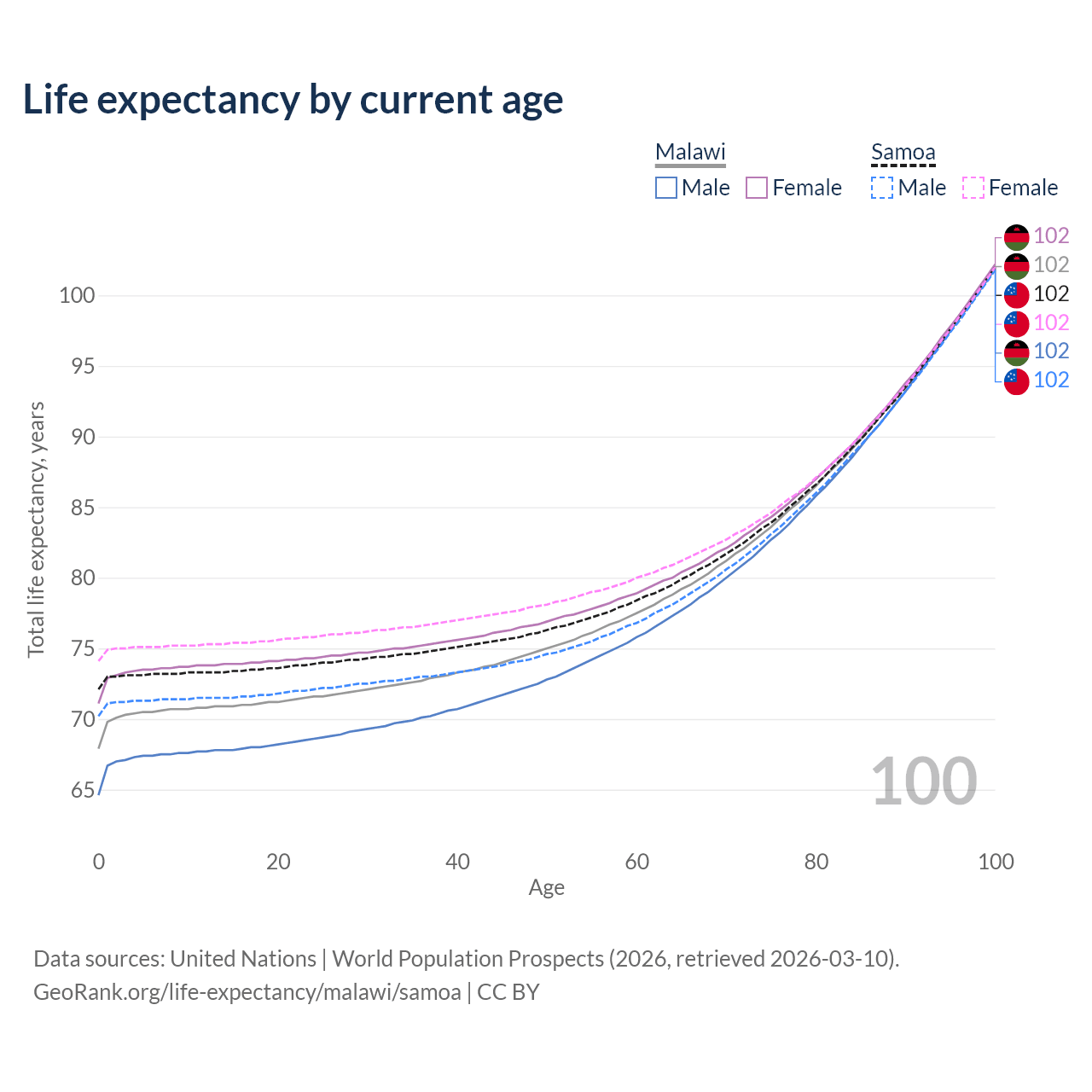 This life expectancy calculator shows the odds of living to 100, 95, 90, and below based on current age for both males and females in Malawi and Samoa, along with mean and median age of death. The calculations are based on the 2026 life tables (actuarial tables) from the UN World Population Prospects.