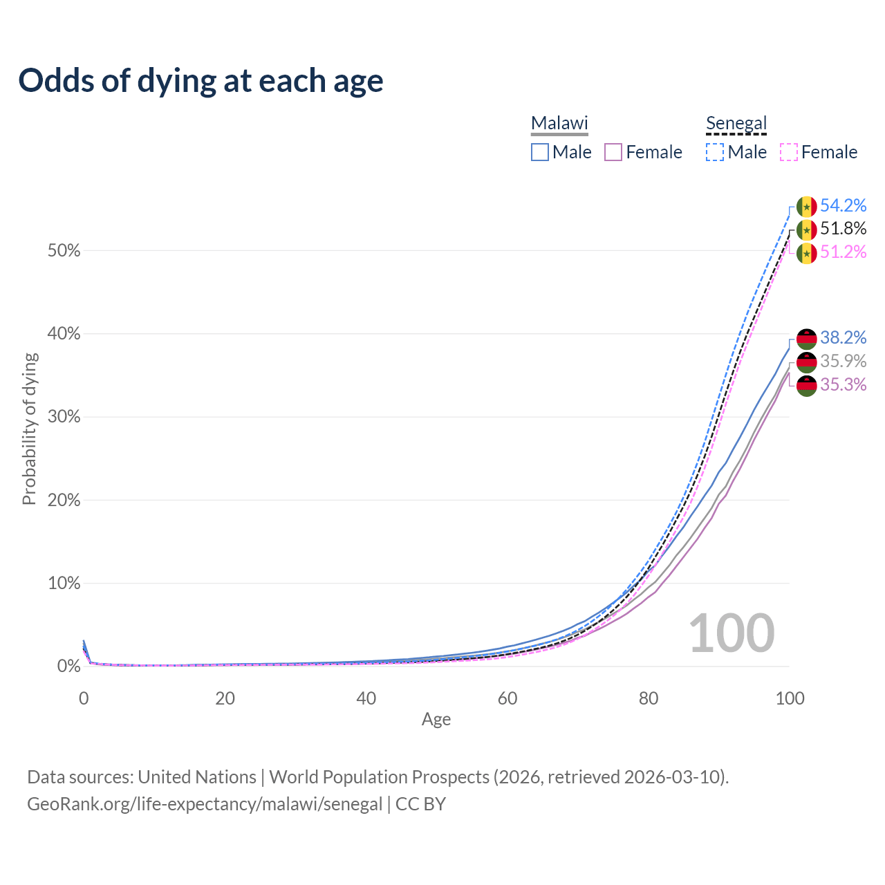 This life expectancy calculator shows the odds of living to 100, 95, 90, and below based on current age for both males and females in Malawi and Senegal, along with mean and median age of death. The calculations are based on the 2026 life tables (actuarial tables) from the UN World Population Prospects.