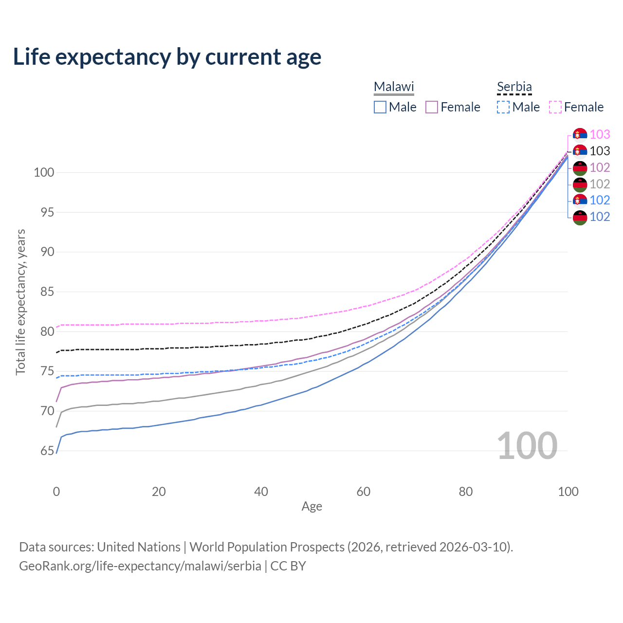 This life expectancy calculator shows the odds of living to 100, 95, 90, and below based on current age for both males and females in Malawi and Serbia, along with mean and median age of death. The calculations are based on the 2026 life tables (actuarial tables) from the UN World Population Prospects.