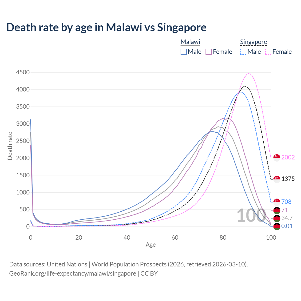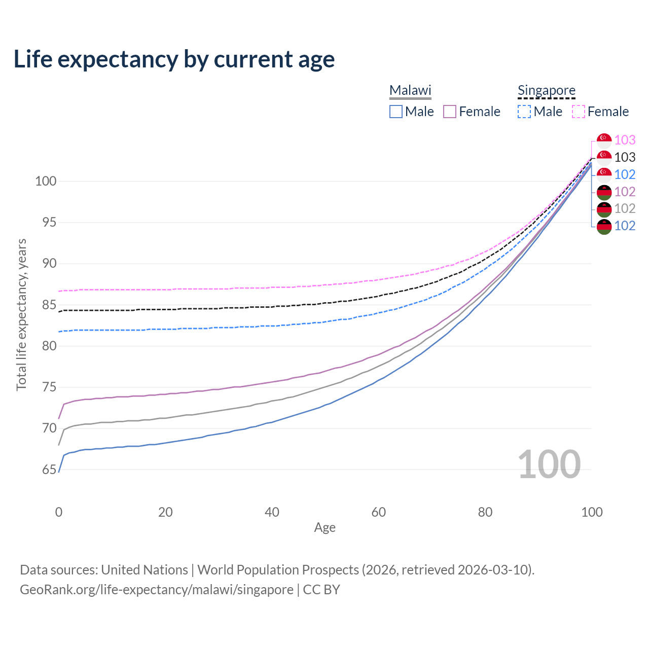 This life expectancy calculator shows the odds of living to 100, 95, 90, and below based on current age for both males and females in Malawi and Singapore, along with mean and median age of death. The calculations are based on the 2026 life tables (actuarial tables) from the UN World Population Prospects.