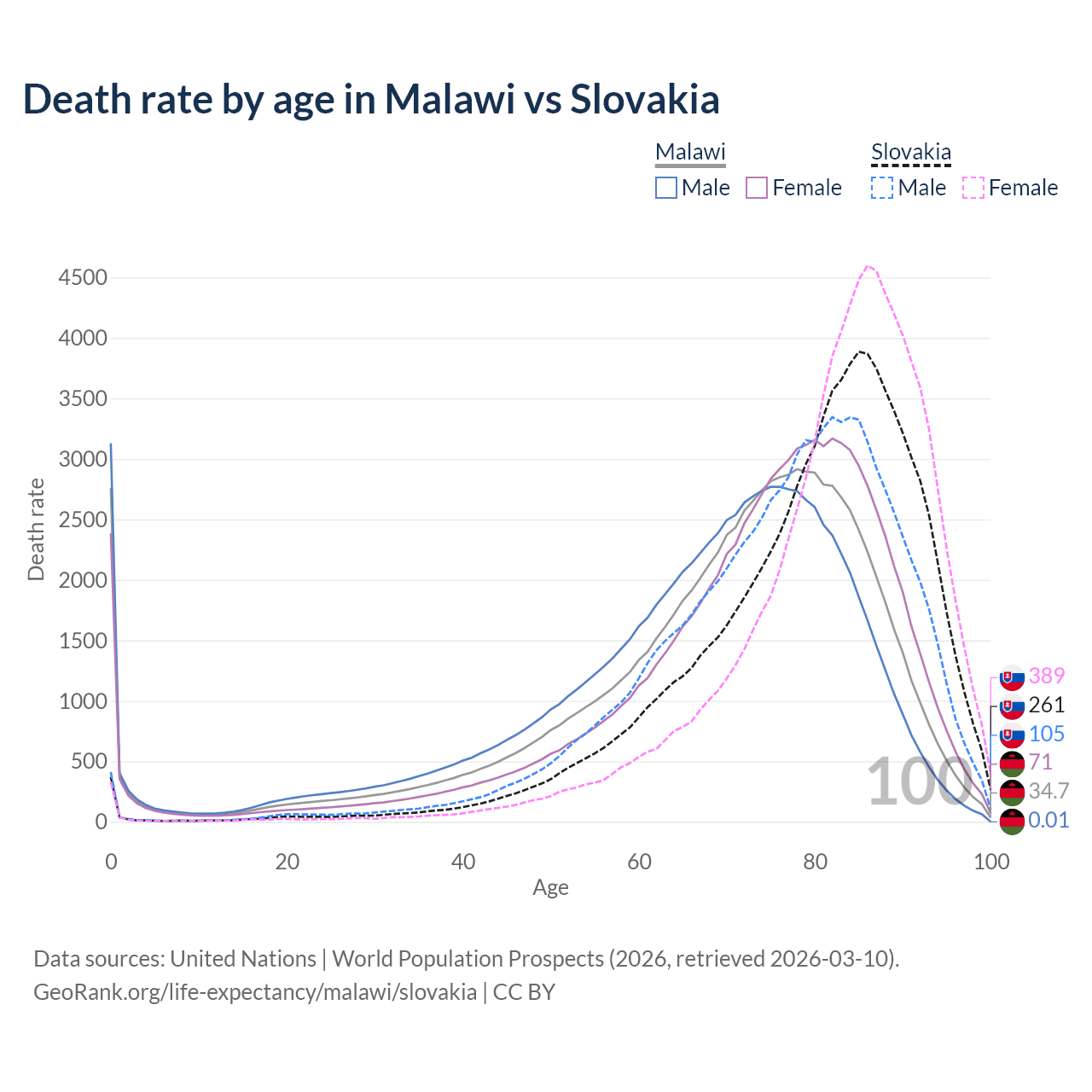 This life expectancy calculator shows the odds of living to 100, 95, 90, and below based on current age for both males and females in Malawi and Slovakia, along with mean and median age of death. The calculations are based on the 2026 life tables (actuarial tables) from the UN World Population Prospects.