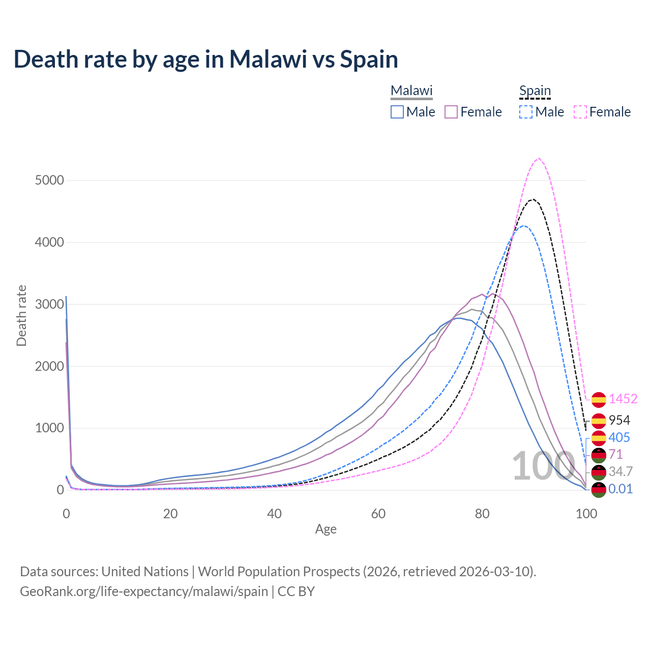 This life expectancy calculator shows the odds of living to 100, 95, 90, and below based on current age for both males and females in Malawi and Spain, along with mean and median age of death. The calculations are based on the 2026 life tables (actuarial tables) from the UN World Population Prospects.