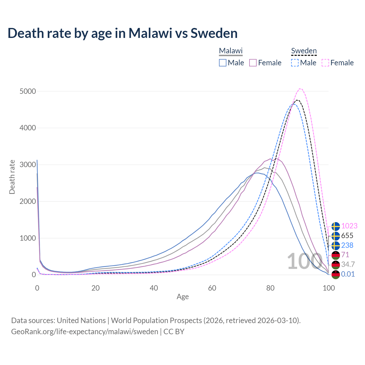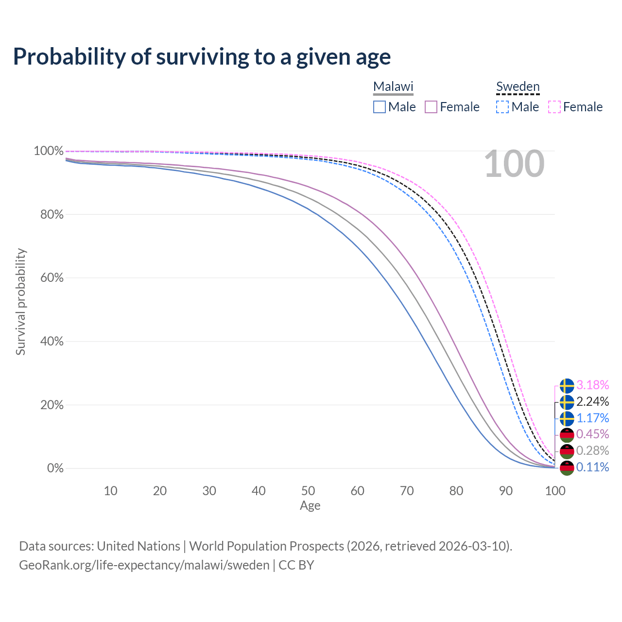 This life expectancy calculator shows the odds of living to 100, 95, 90, and below based on current age for both males and females in Malawi and Sweden, along with mean and median age of death. The calculations are based on the 2026 life tables (actuarial tables) from the UN World Population Prospects.