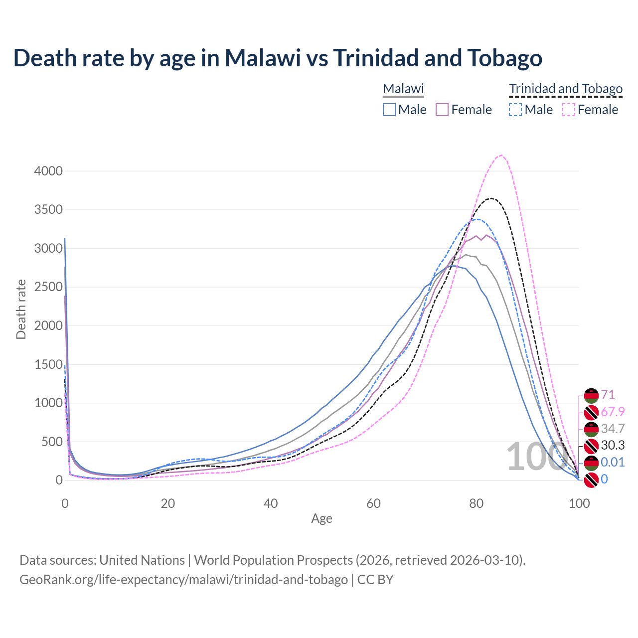 This life expectancy calculator shows the odds of living to 100, 95, 90, and below based on current age for both males and females in Malawi and Trinidad and Tobago, along with mean and median age of death. The calculations are based on the 2026 life tables (actuarial tables) from the UN World Population Prospects.