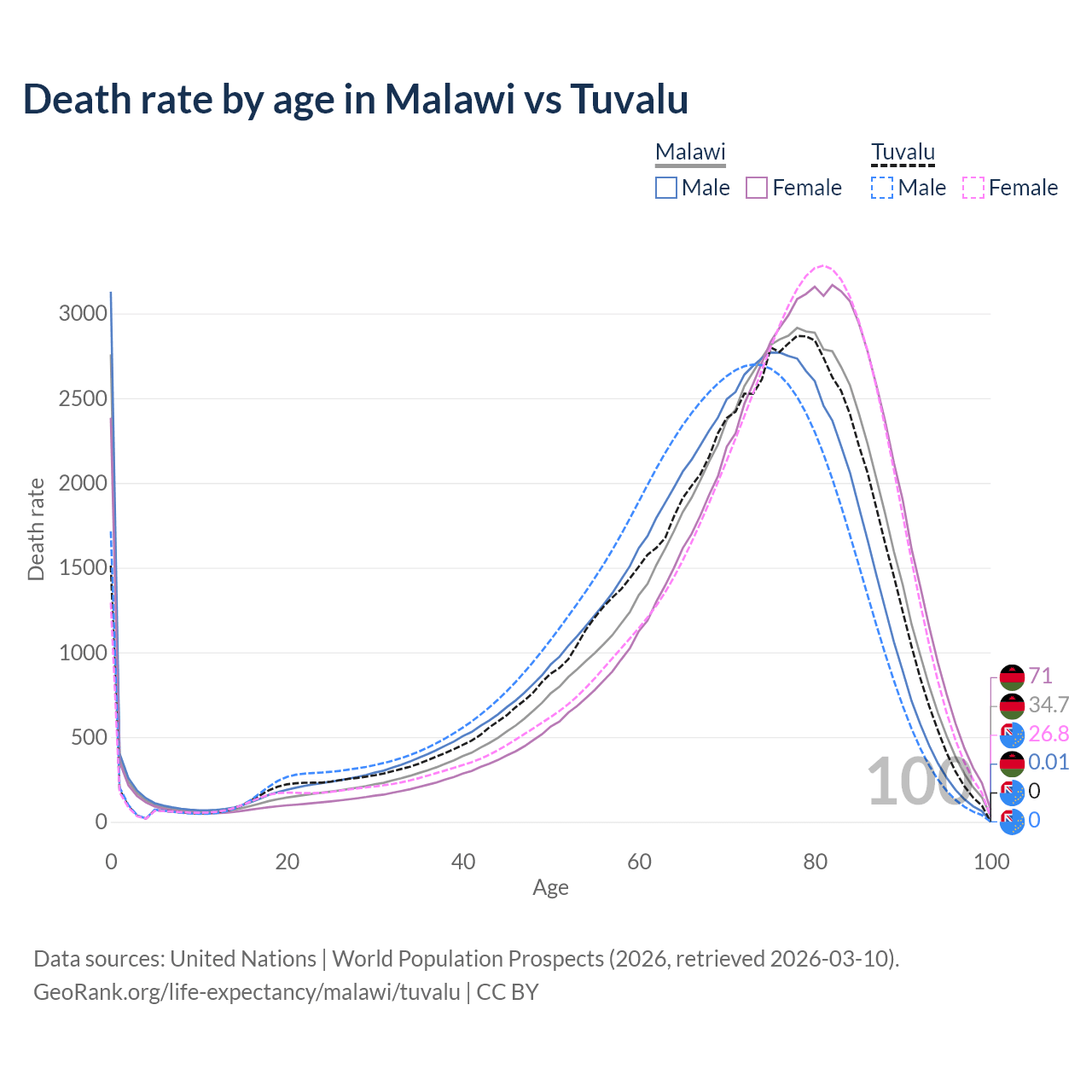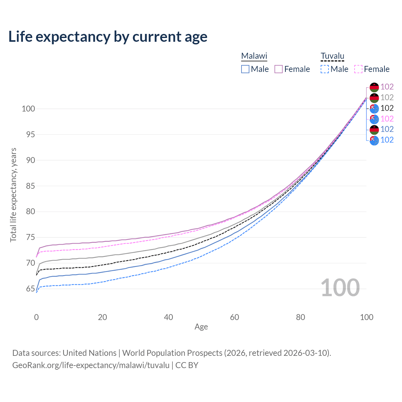 This life expectancy calculator shows the odds of living to 100, 95, 90, and below based on current age for both males and females in Malawi and Tuvalu, along with mean and median age of death. The calculations are based on the 2026 life tables (actuarial tables) from the UN World Population Prospects.