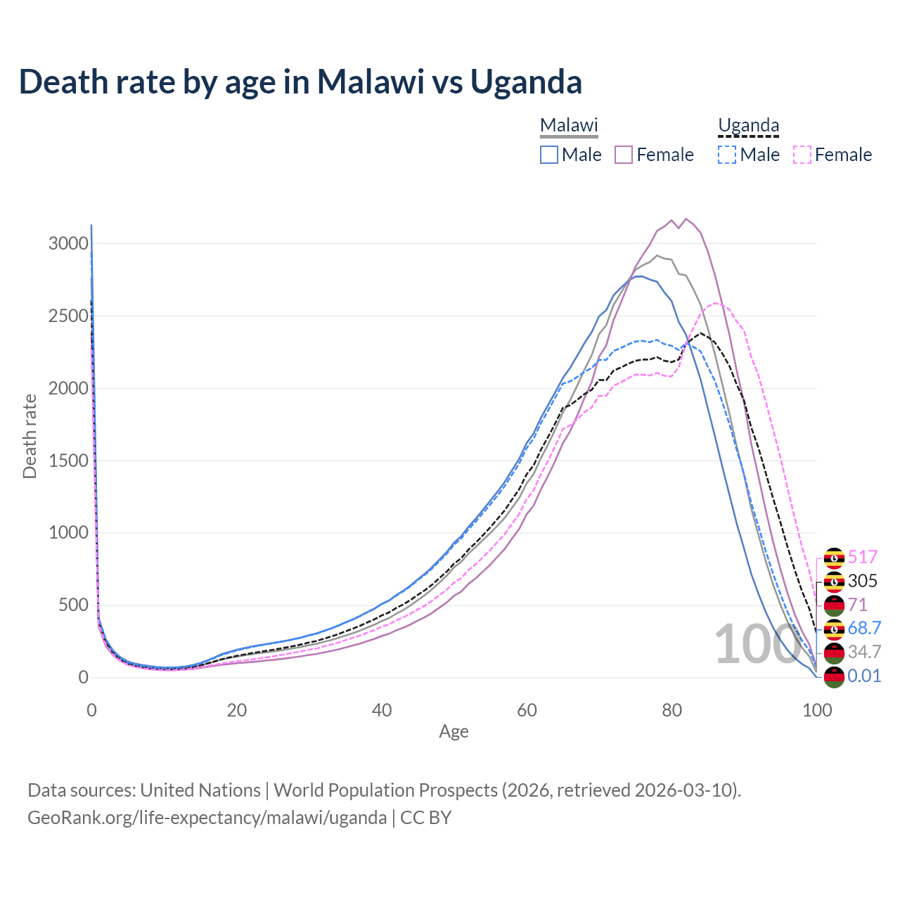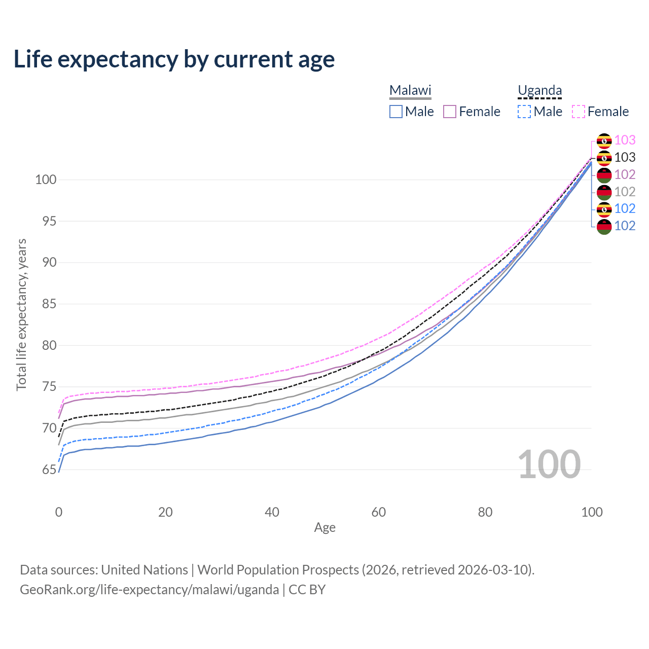 This life expectancy calculator shows the odds of living to 100, 95, 90, and below based on current age for both males and females in Malawi and Uganda, along with mean and median age of death. The calculations are based on the 2026 life tables (actuarial tables) from the UN World Population Prospects.
