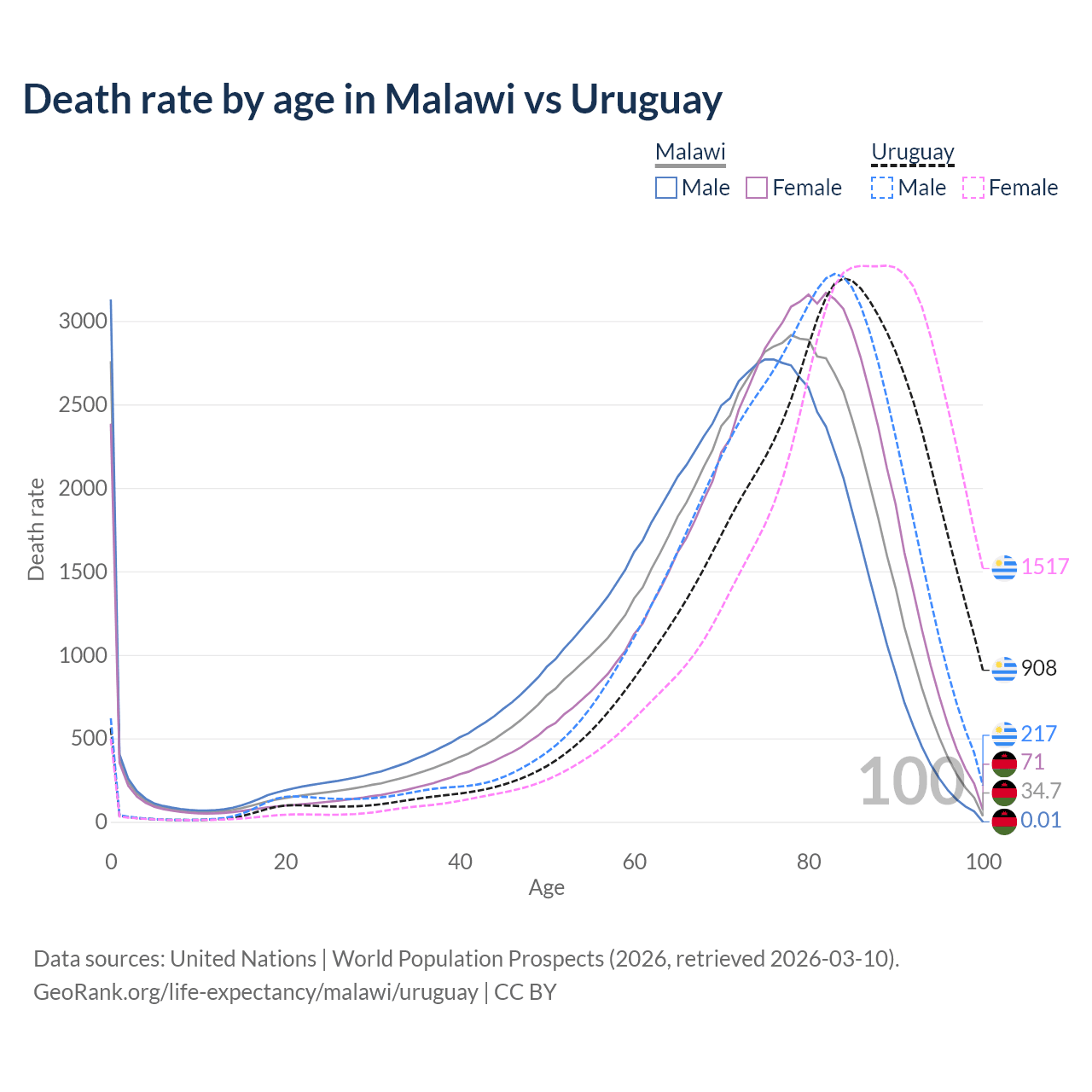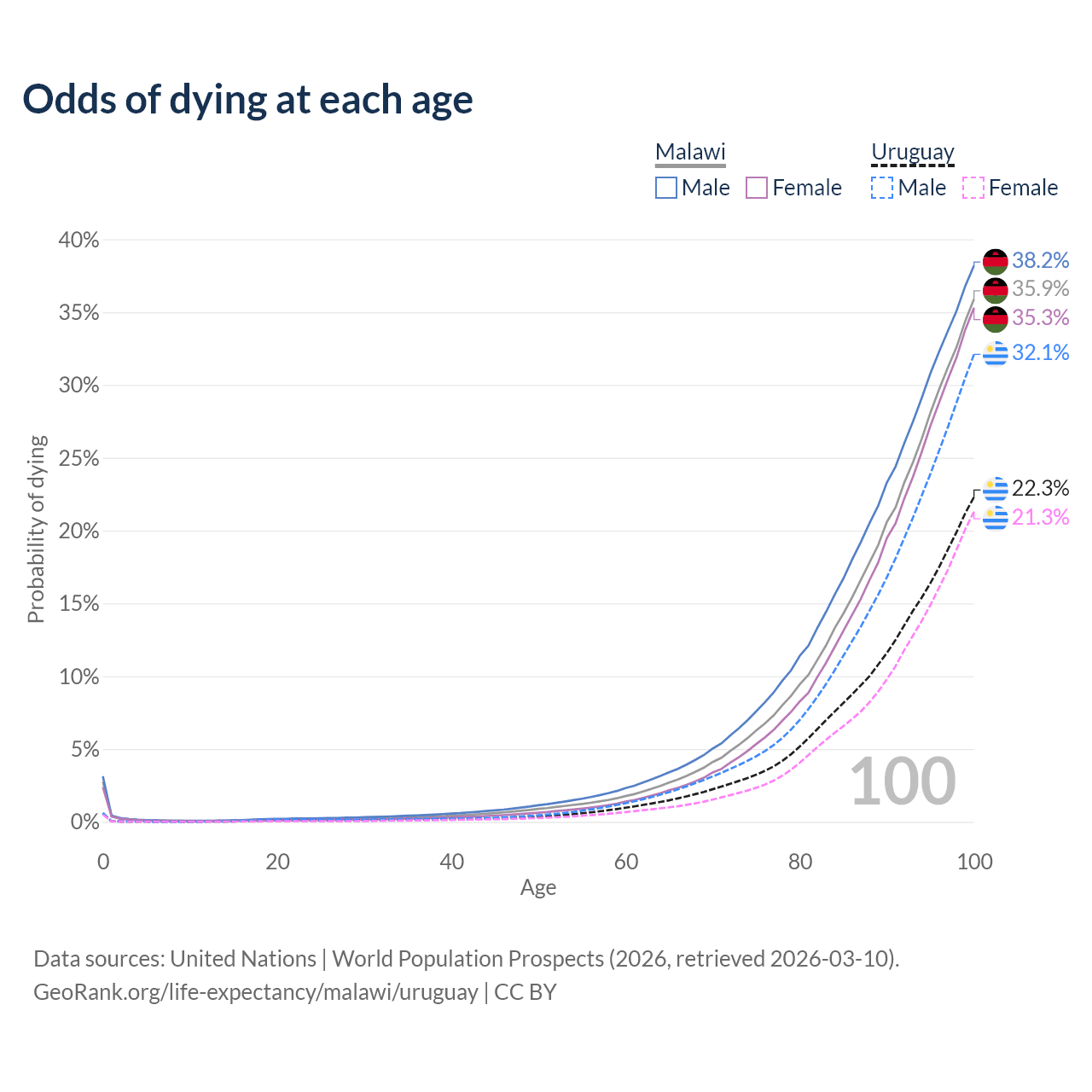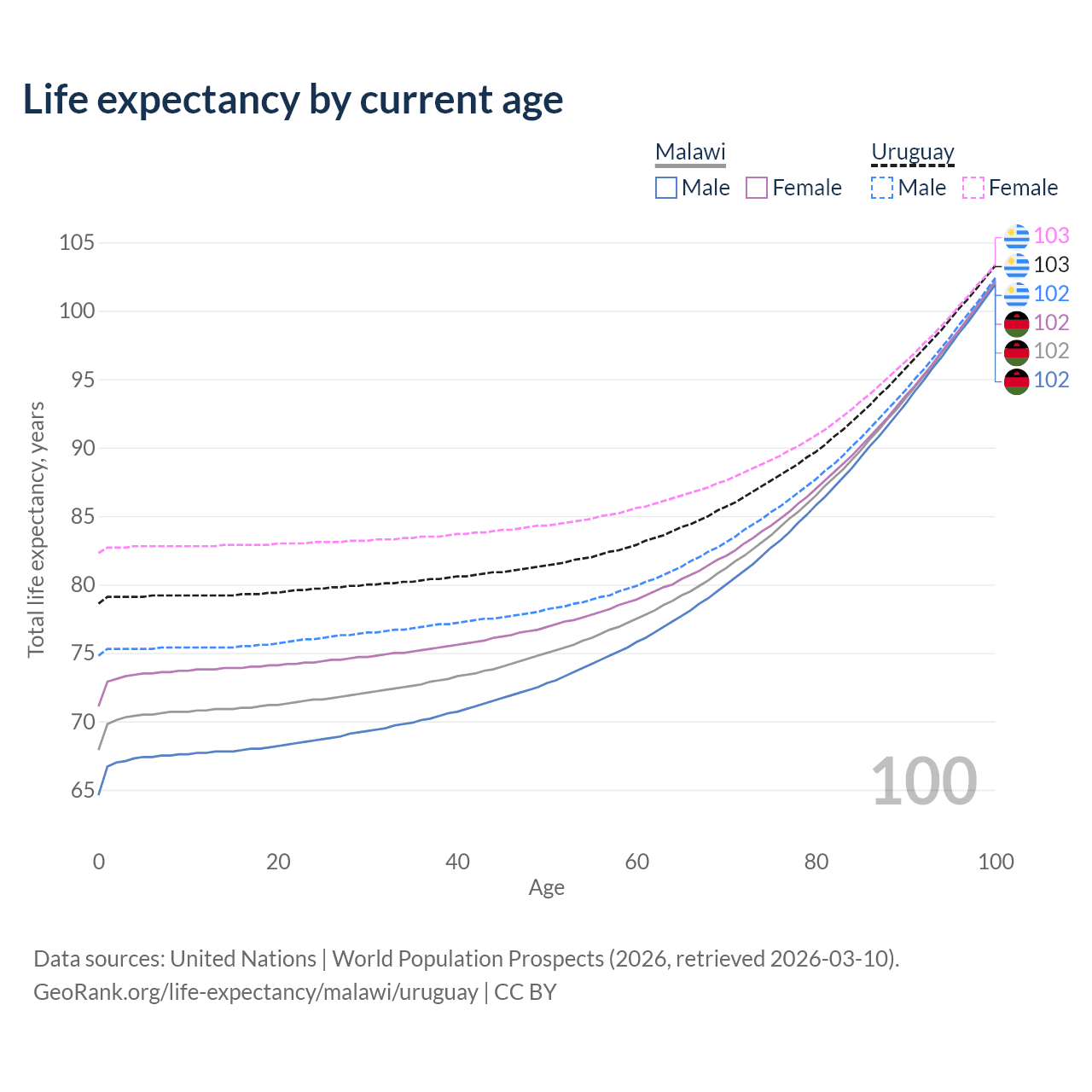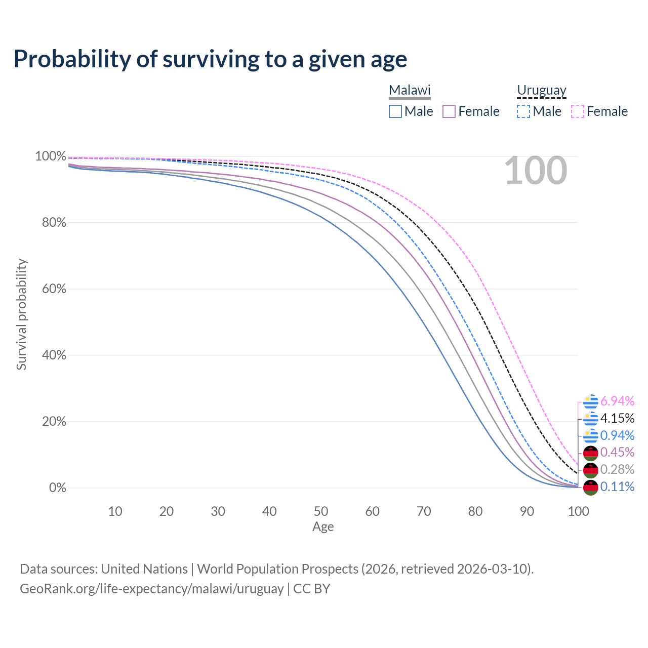 This life expectancy calculator shows the odds of living to 100, 95, 90, and below based on current age for both males and females in Malawi and Uruguay, along with mean and median age of death. The calculations are based on the 2026 life tables (actuarial tables) from the UN World Population Prospects.