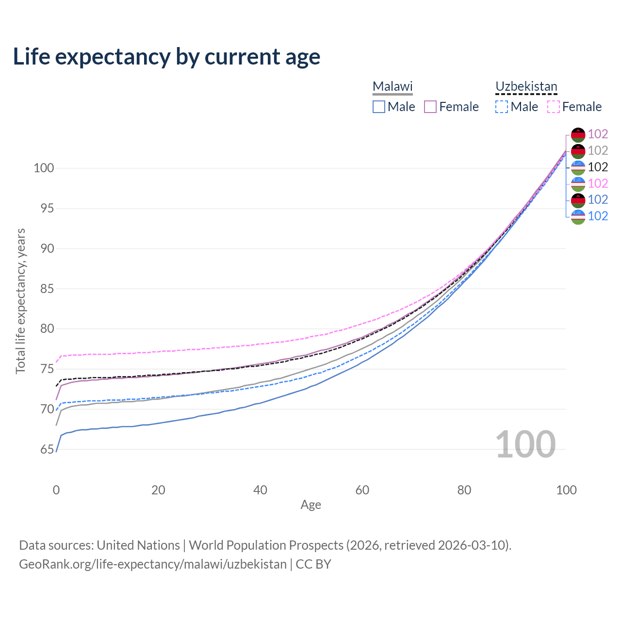 This life expectancy calculator shows the odds of living to 100, 95, 90, and below based on current age for both males and females in Malawi and Uzbekistan, along with mean and median age of death. The calculations are based on the 2026 life tables (actuarial tables) from the UN World Population Prospects.