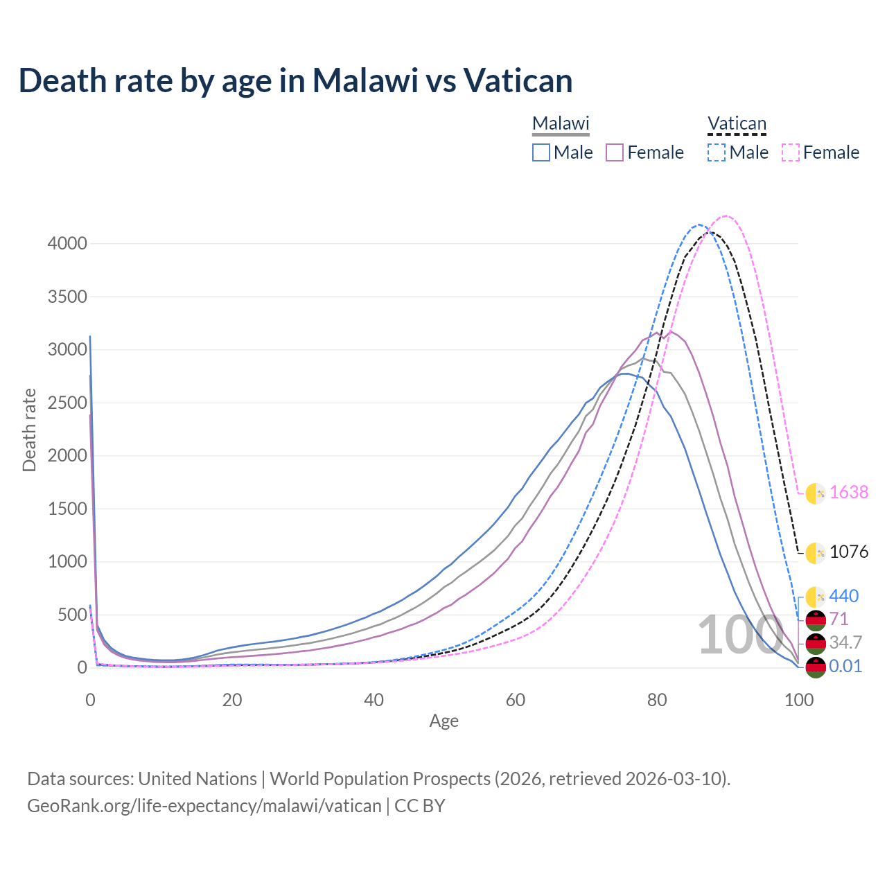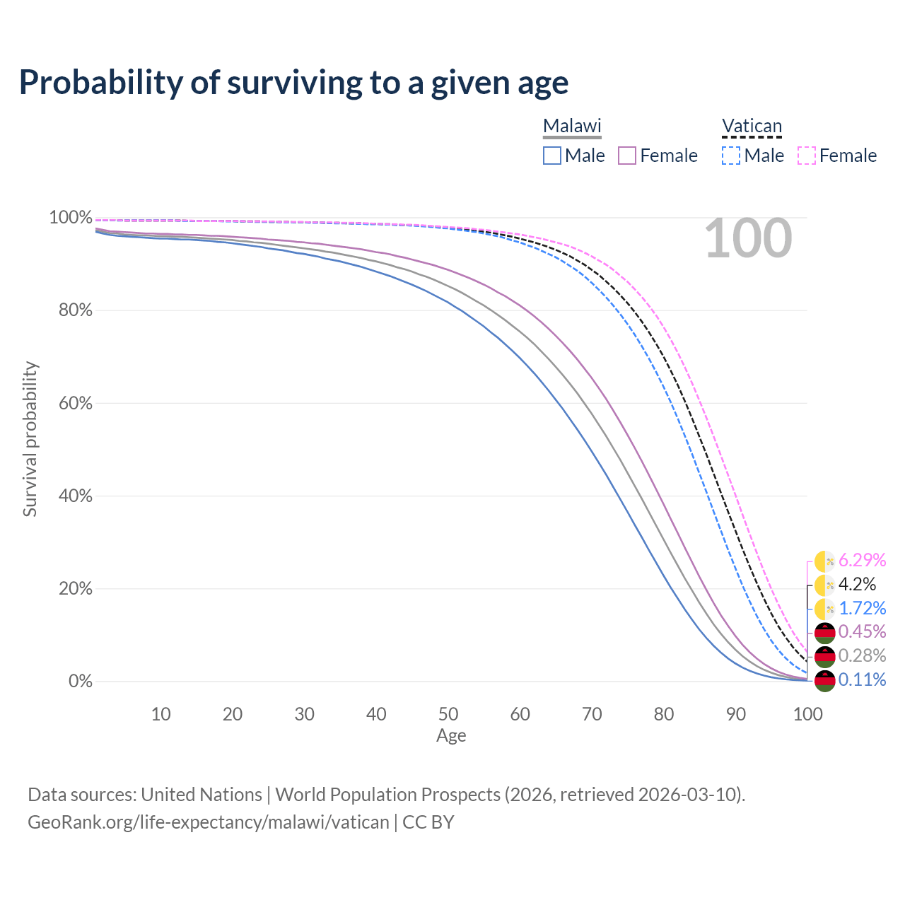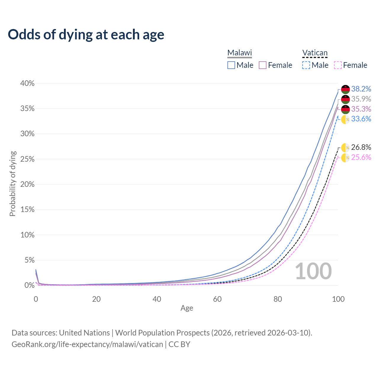 This life expectancy calculator shows the odds of living to 100, 95, 90, and below based on current age for both males and females in Malawi and the Vatican, along with mean and median age of death. The calculations are based on the 2026 life tables (actuarial tables) from the UN World Population Prospects.