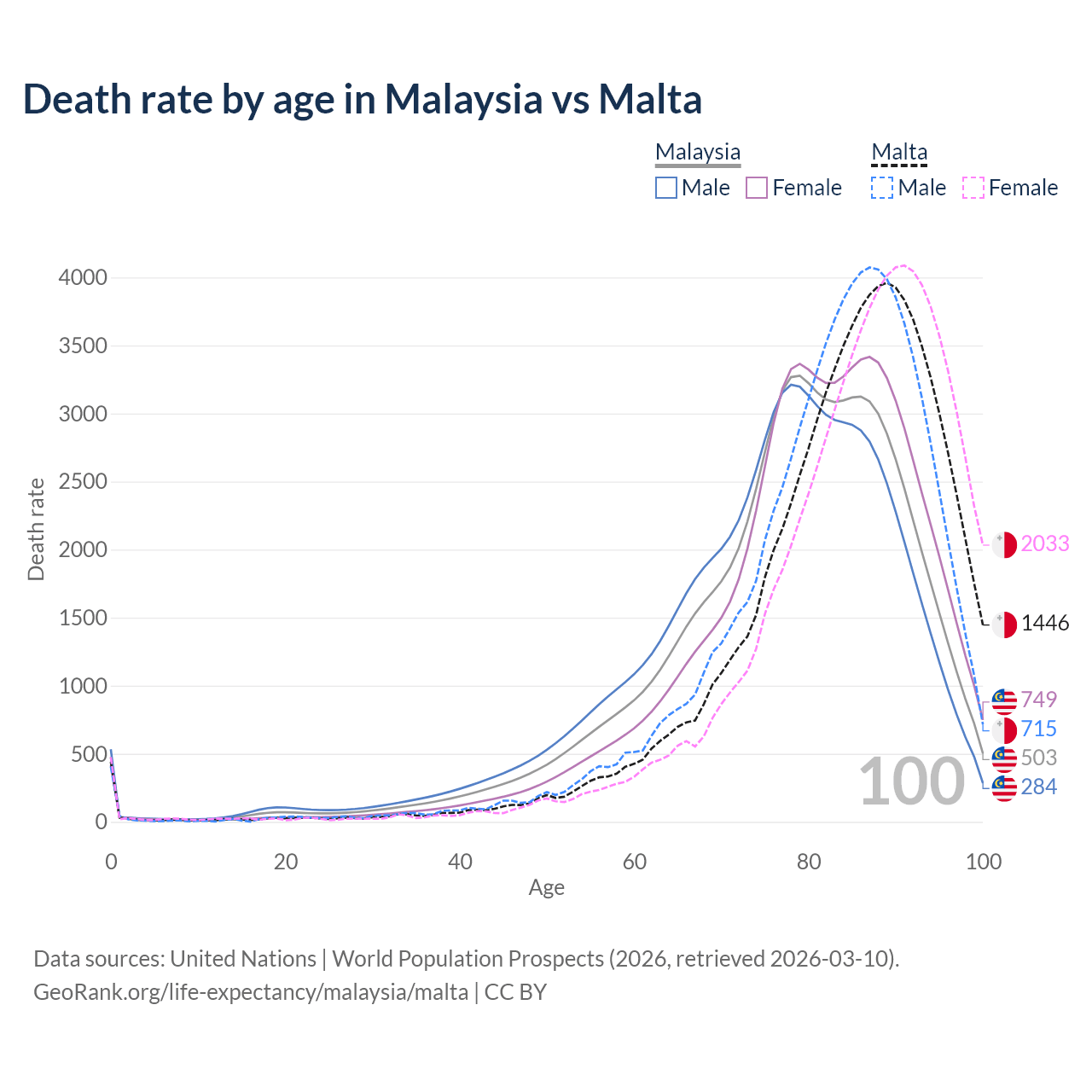 This life expectancy calculator shows the odds of living to 100, 95, 90, and below based on current age for both males and females in Malaysia and Malta, along with mean and median age of death. The calculations are based on the 2026 life tables (actuarial tables) from the UN World Population Prospects.