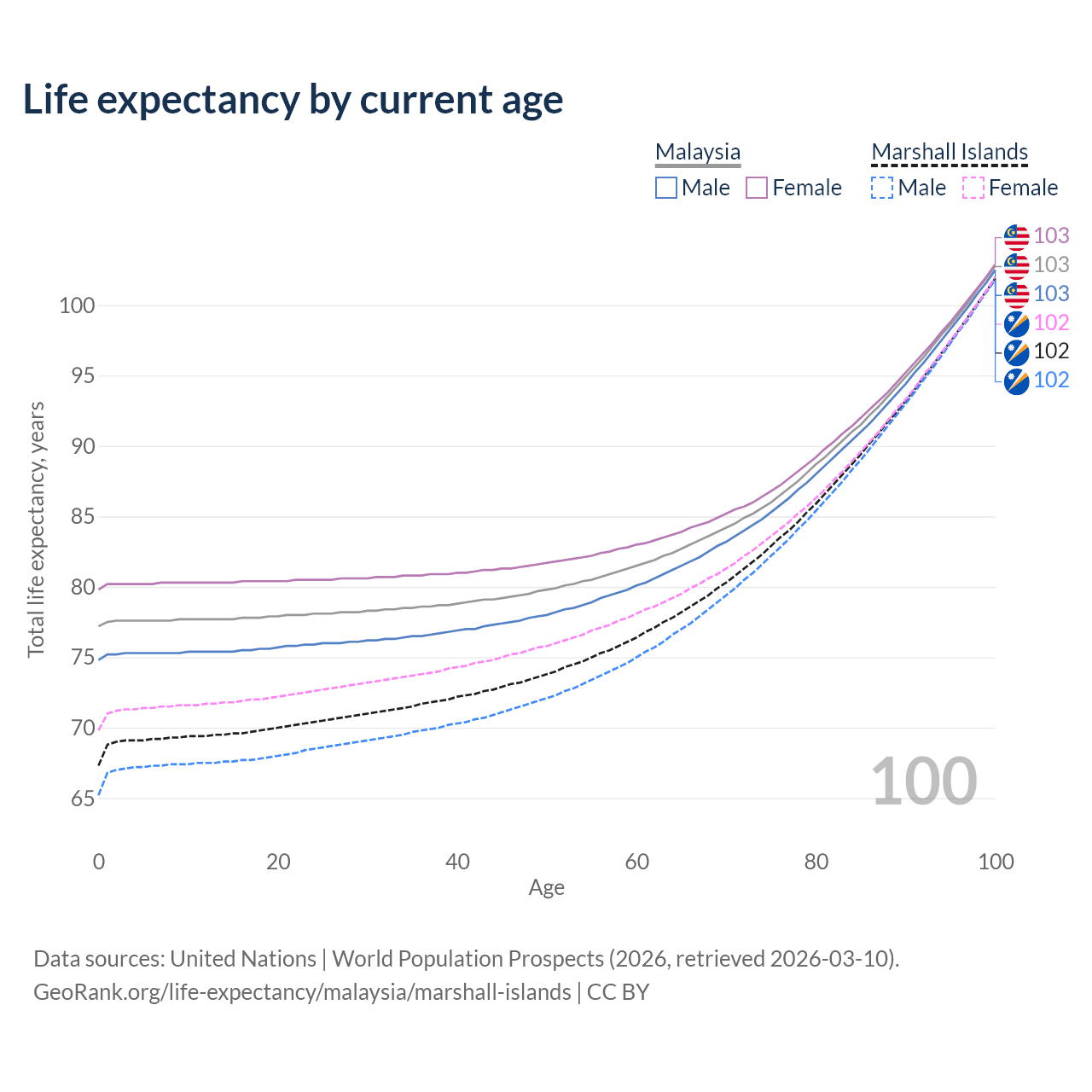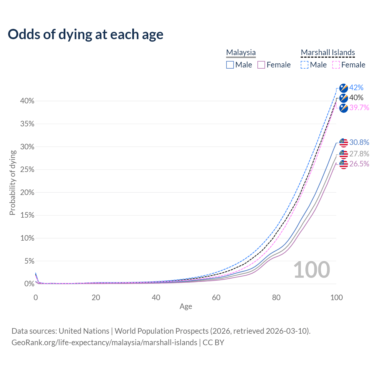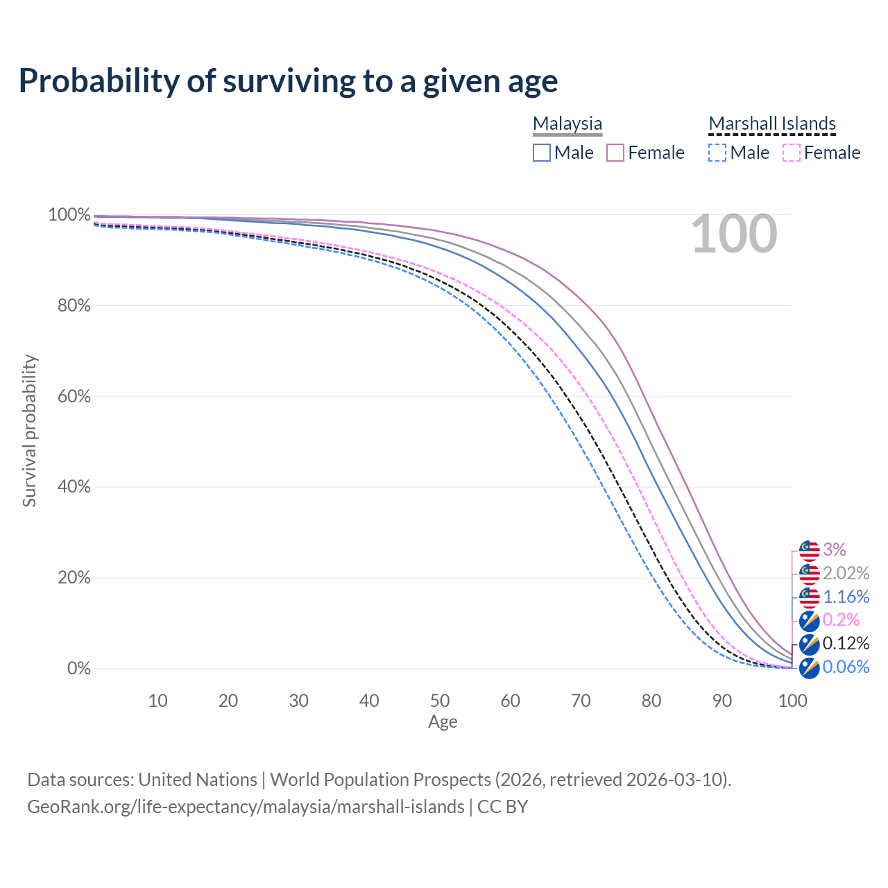 This life expectancy calculator shows the odds of living to 100, 95, 90, and below based on current age for both males and females in Malaysia and the Marshall Islands, along with mean and median age of death. The calculations are based on the 2026 life tables (actuarial tables) from the UN World Population Prospects.