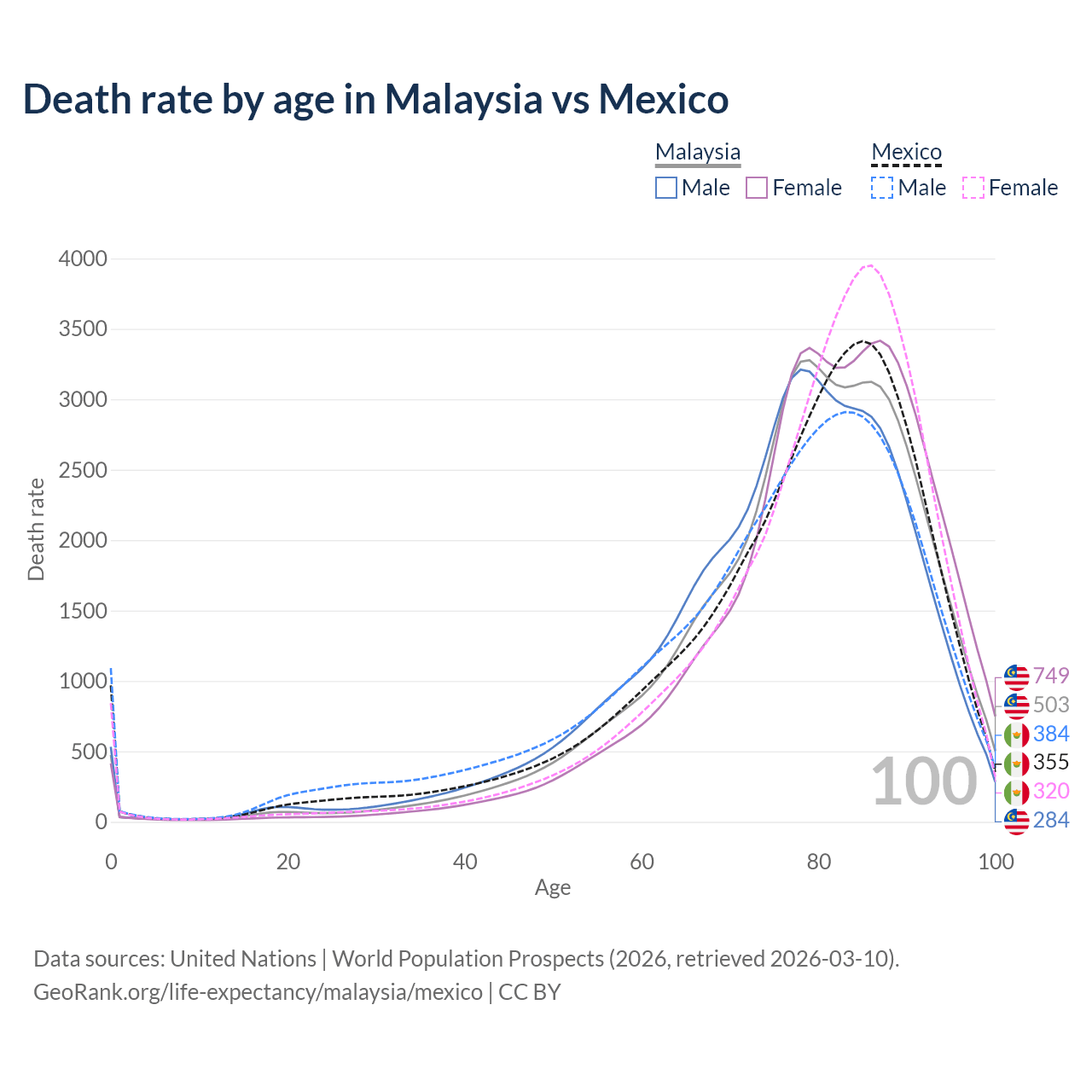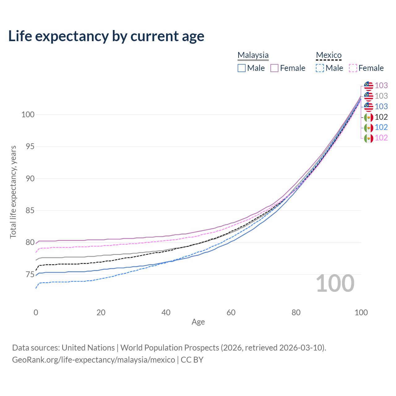 This life expectancy calculator shows the odds of living to 100, 95, 90, and below based on current age for both males and females in Malaysia and Mexico, along with mean and median age of death. The calculations are based on the 2026 life tables (actuarial tables) from the UN World Population Prospects.