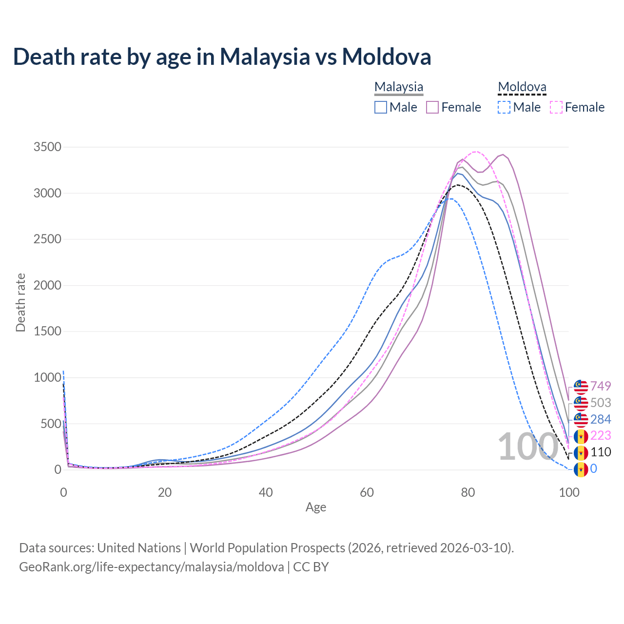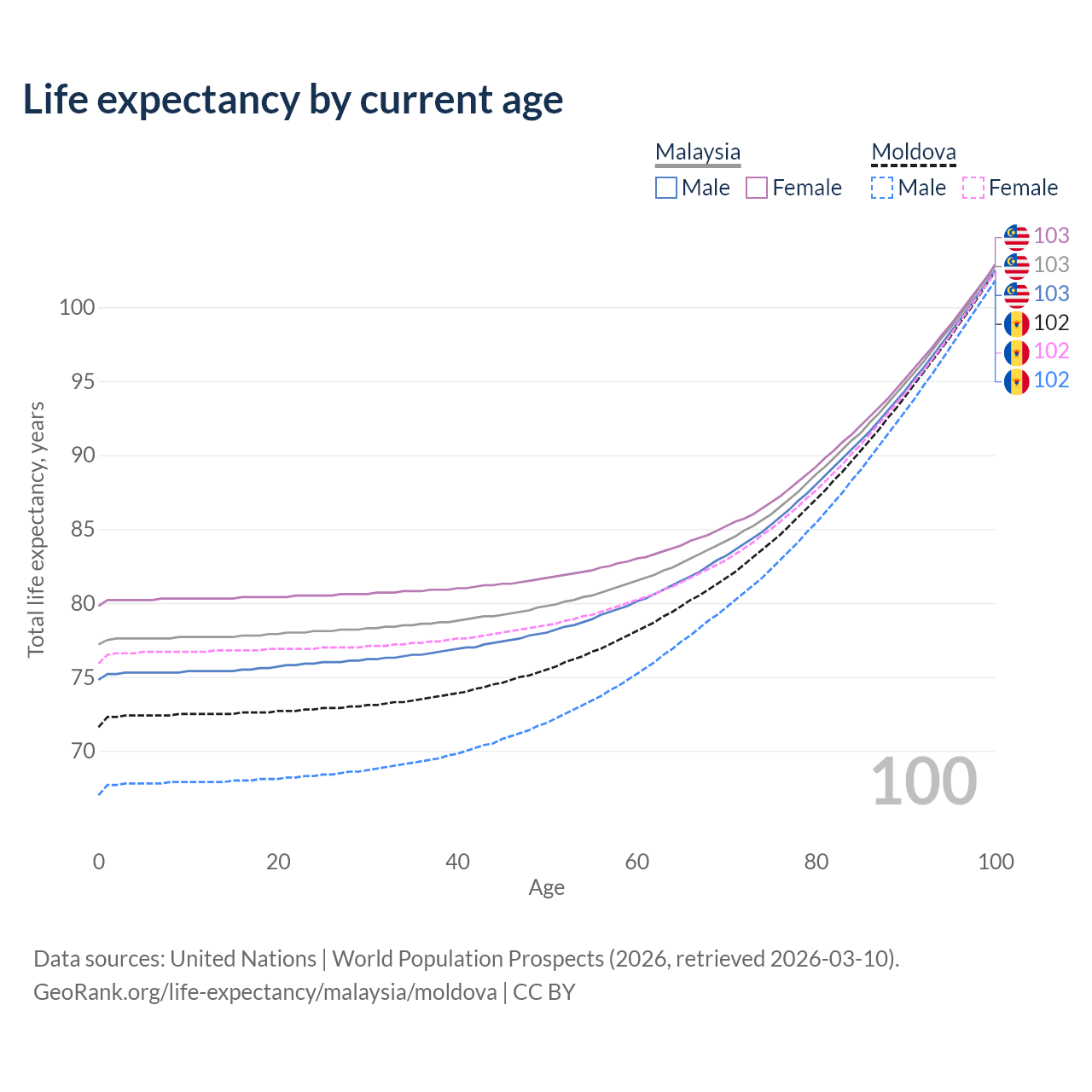 This life expectancy calculator shows the odds of living to 100, 95, 90, and below based on current age for both males and females in Malaysia and Moldova, along with mean and median age of death. The calculations are based on the 2026 life tables (actuarial tables) from the UN World Population Prospects.