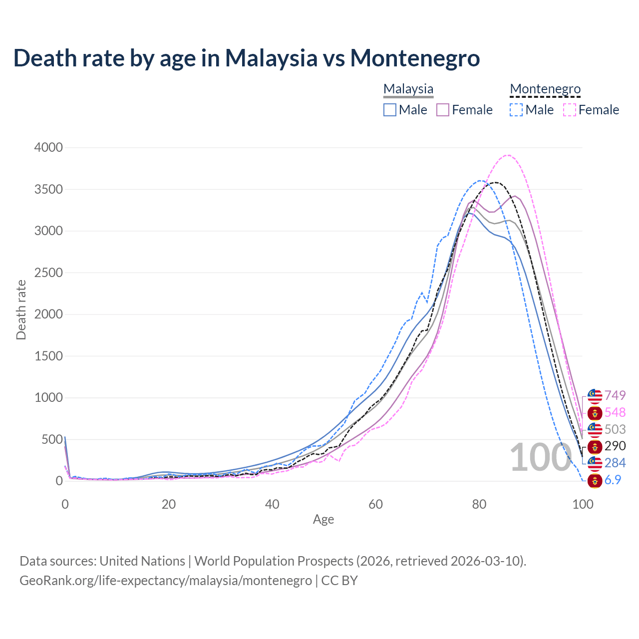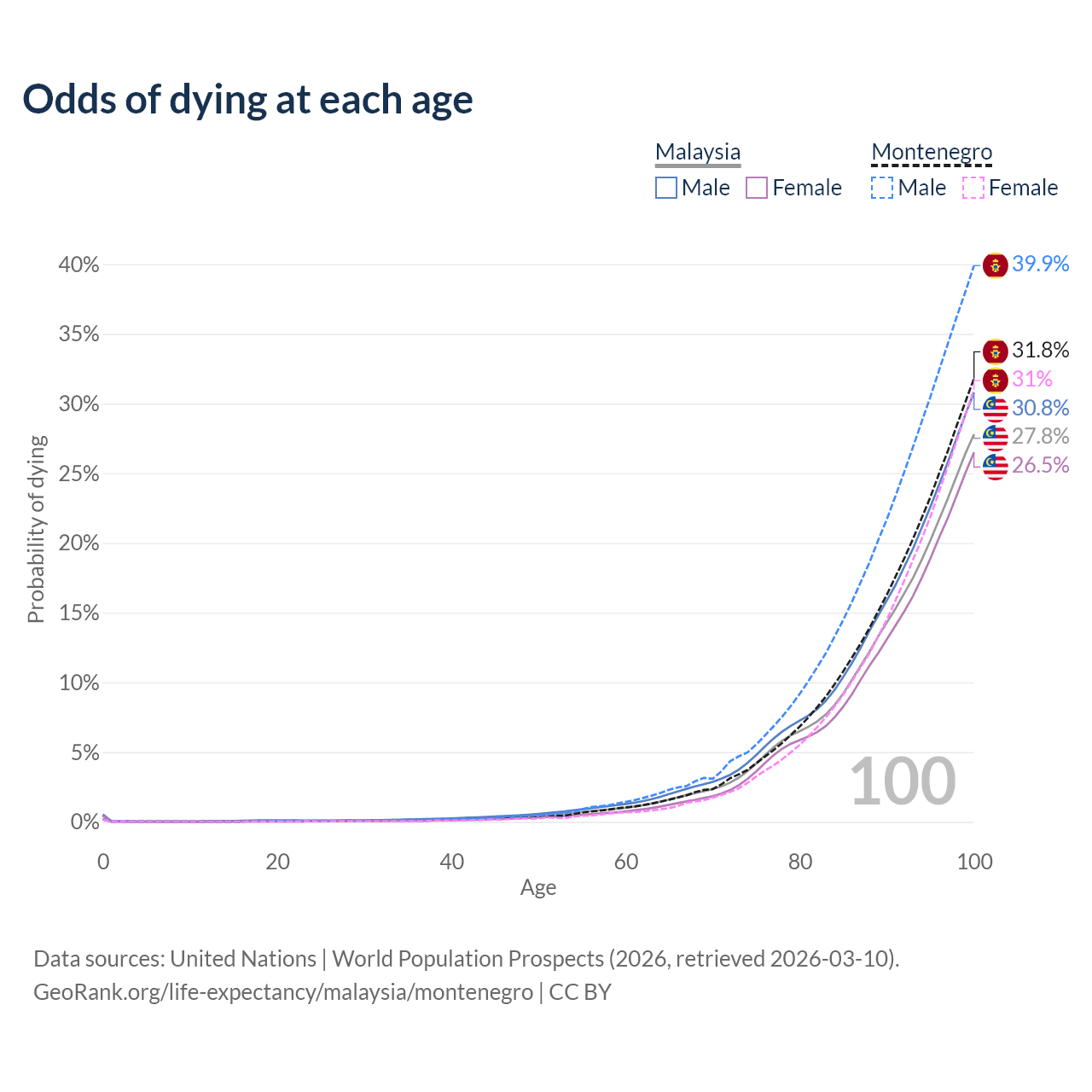This life expectancy calculator shows the odds of living to 100, 95, 90, and below based on current age for both males and females in Malaysia and Montenegro, along with mean and median age of death. The calculations are based on the 2026 life tables (actuarial tables) from the UN World Population Prospects.