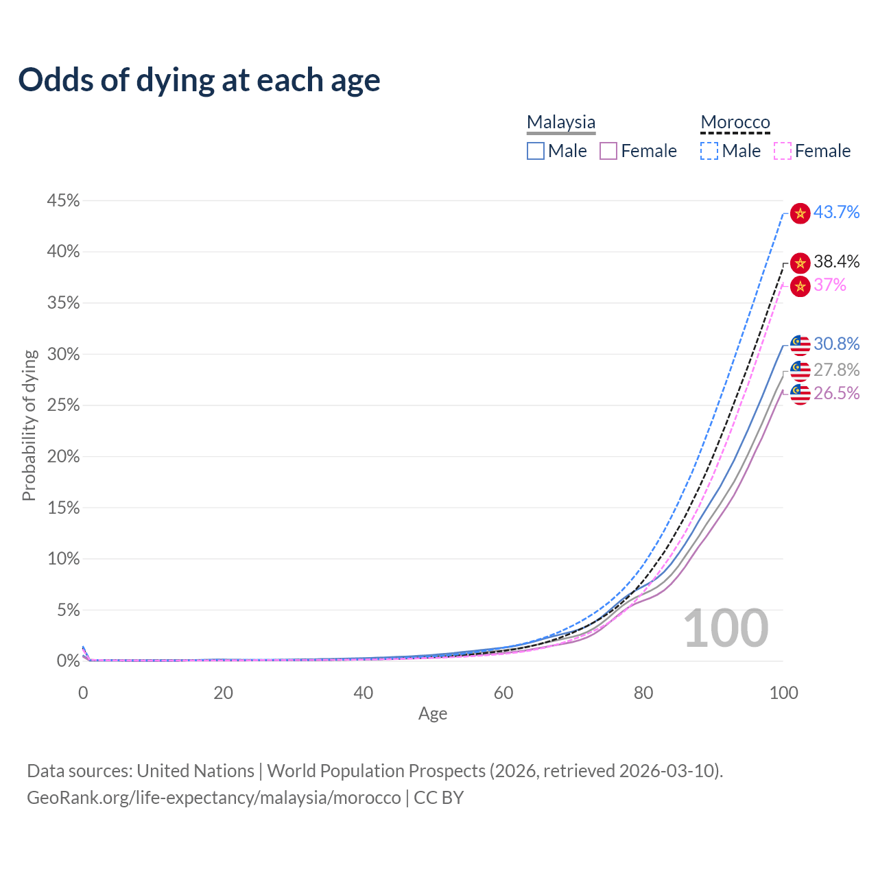 This life expectancy calculator shows the odds of living to 100, 95, 90, and below based on current age for both males and females in Malaysia and Morocco, along with mean and median age of death. The calculations are based on the 2026 life tables (actuarial tables) from the UN World Population Prospects.