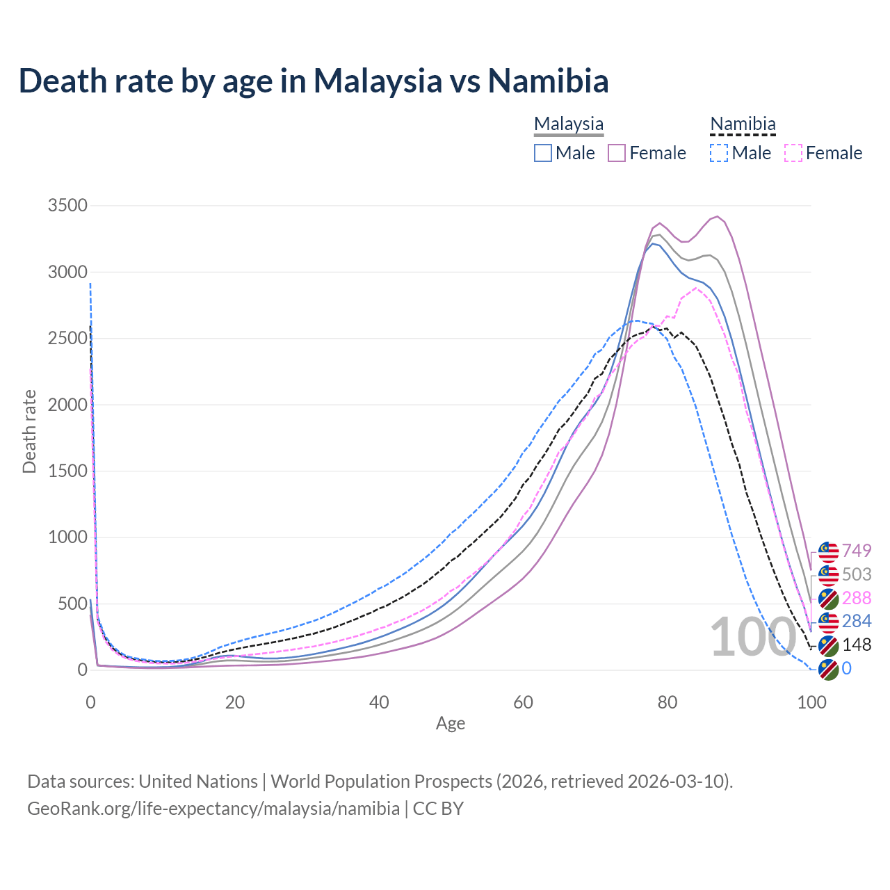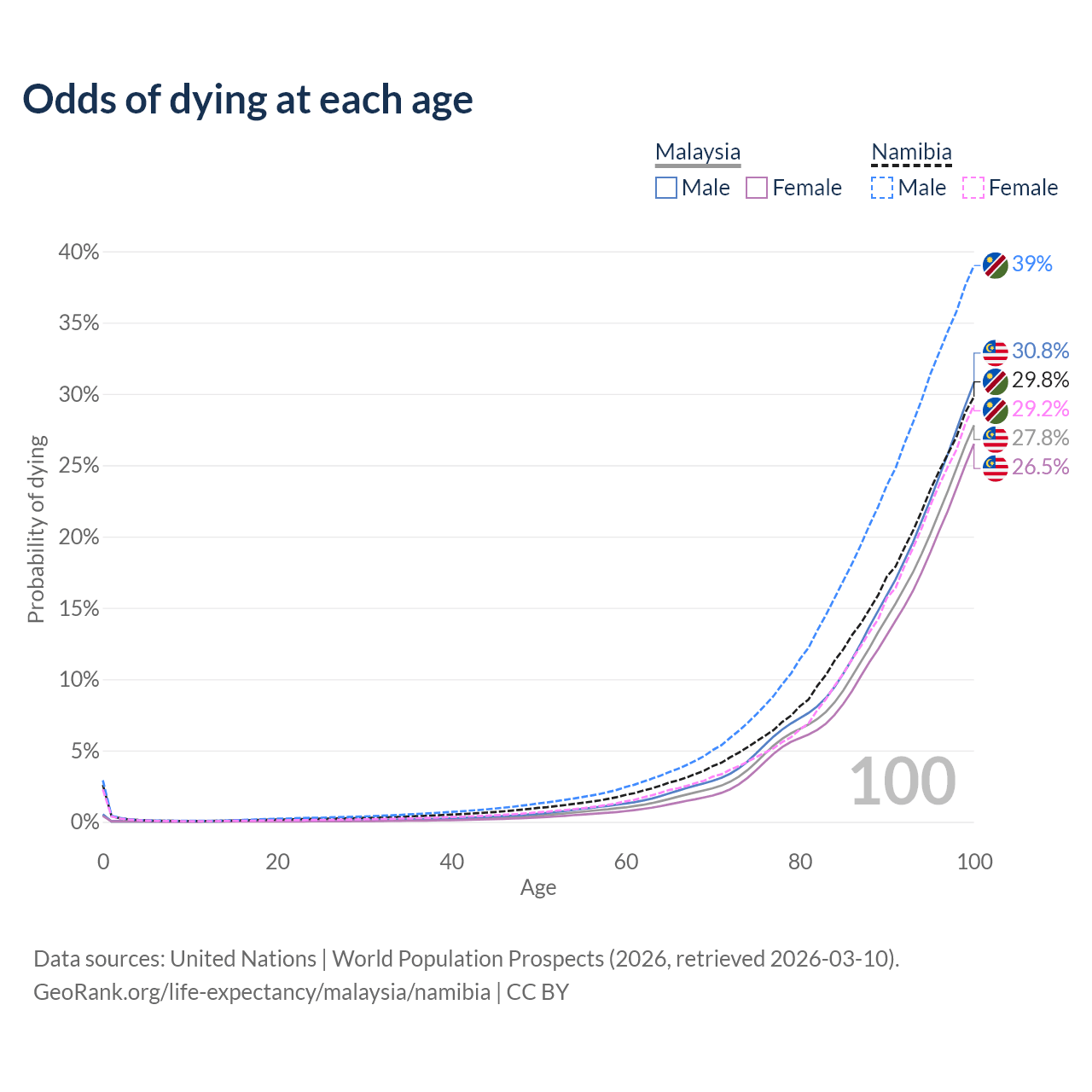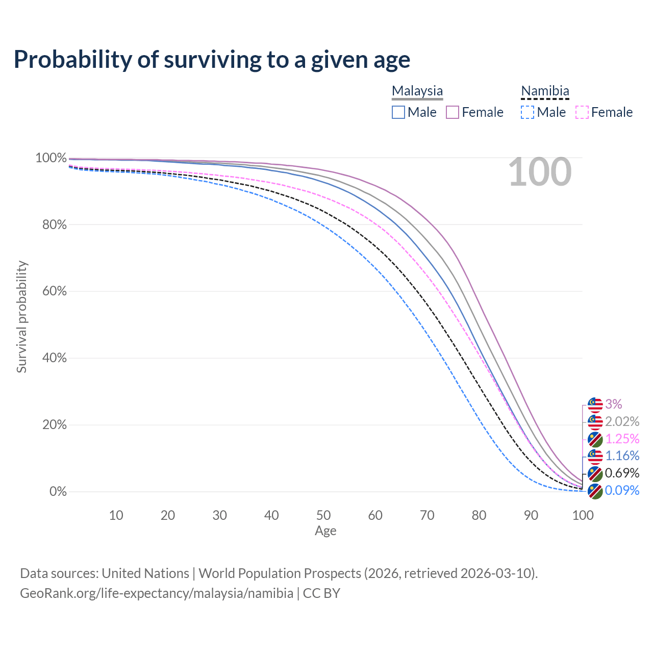 This life expectancy calculator shows the odds of living to 100, 95, 90, and below based on current age for both males and females in Malaysia and Namibia, along with mean and median age of death. The calculations are based on the 2026 life tables (actuarial tables) from the UN World Population Prospects.