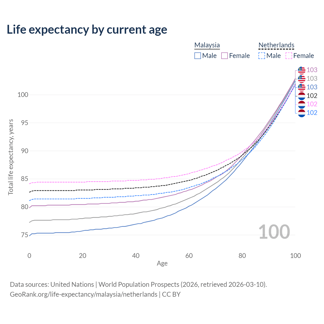 This life expectancy calculator shows the odds of living to 100, 95, 90, and below based on current age for both males and females in Malaysia and the Netherlands, along with mean and median age of death. The calculations are based on the 2026 life tables (actuarial tables) from the UN World Population Prospects.