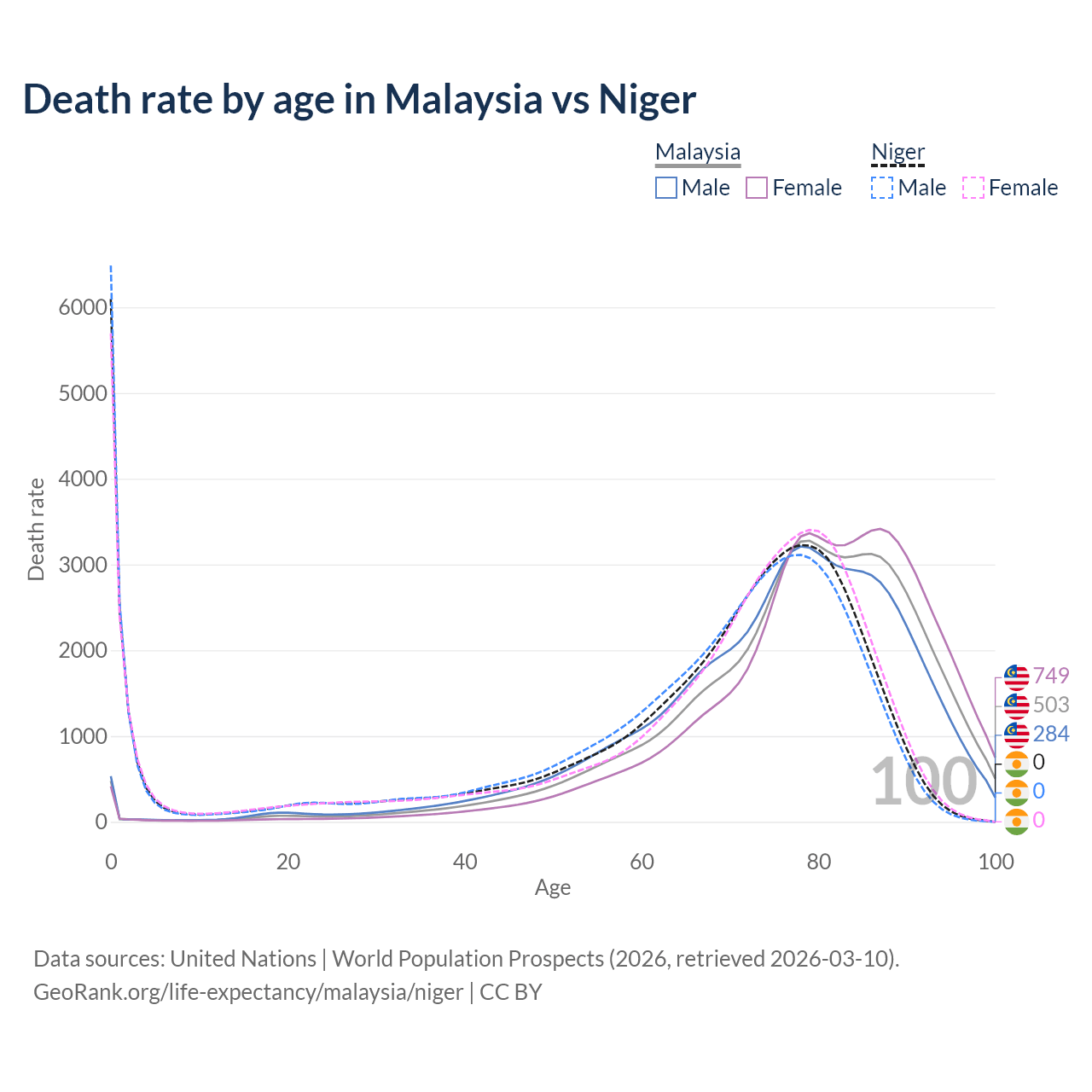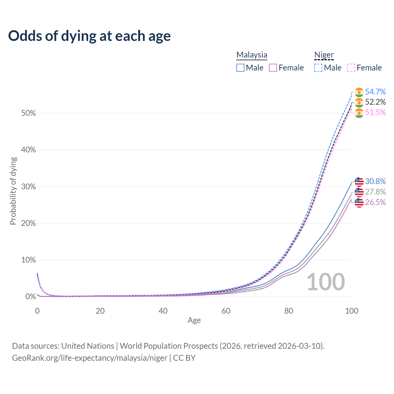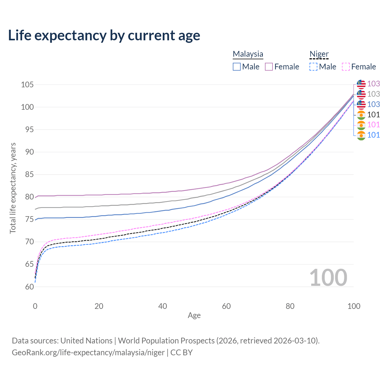 This life expectancy calculator shows the odds of living to 100, 95, 90, and below based on current age for both males and females in Malaysia and Niger, along with mean and median age of death. The calculations are based on the 2026 life tables (actuarial tables) from the UN World Population Prospects.